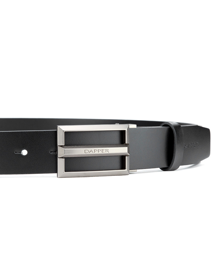 Brick plaque buckle belt in matte polished metal match with smooth black full grain leather Engraved logo on buckle & embossed on leather.