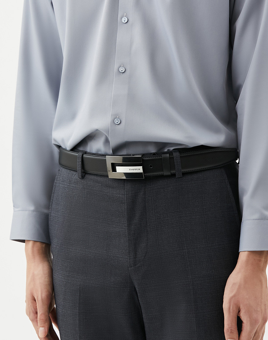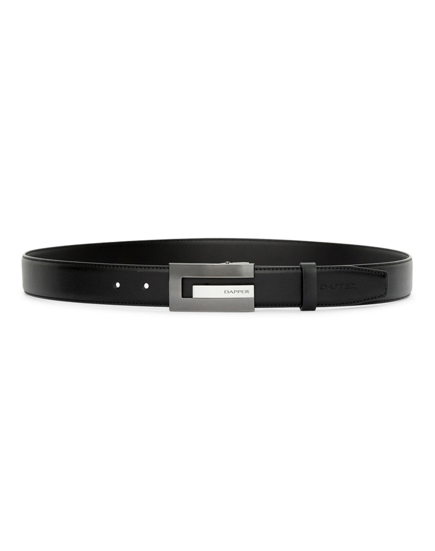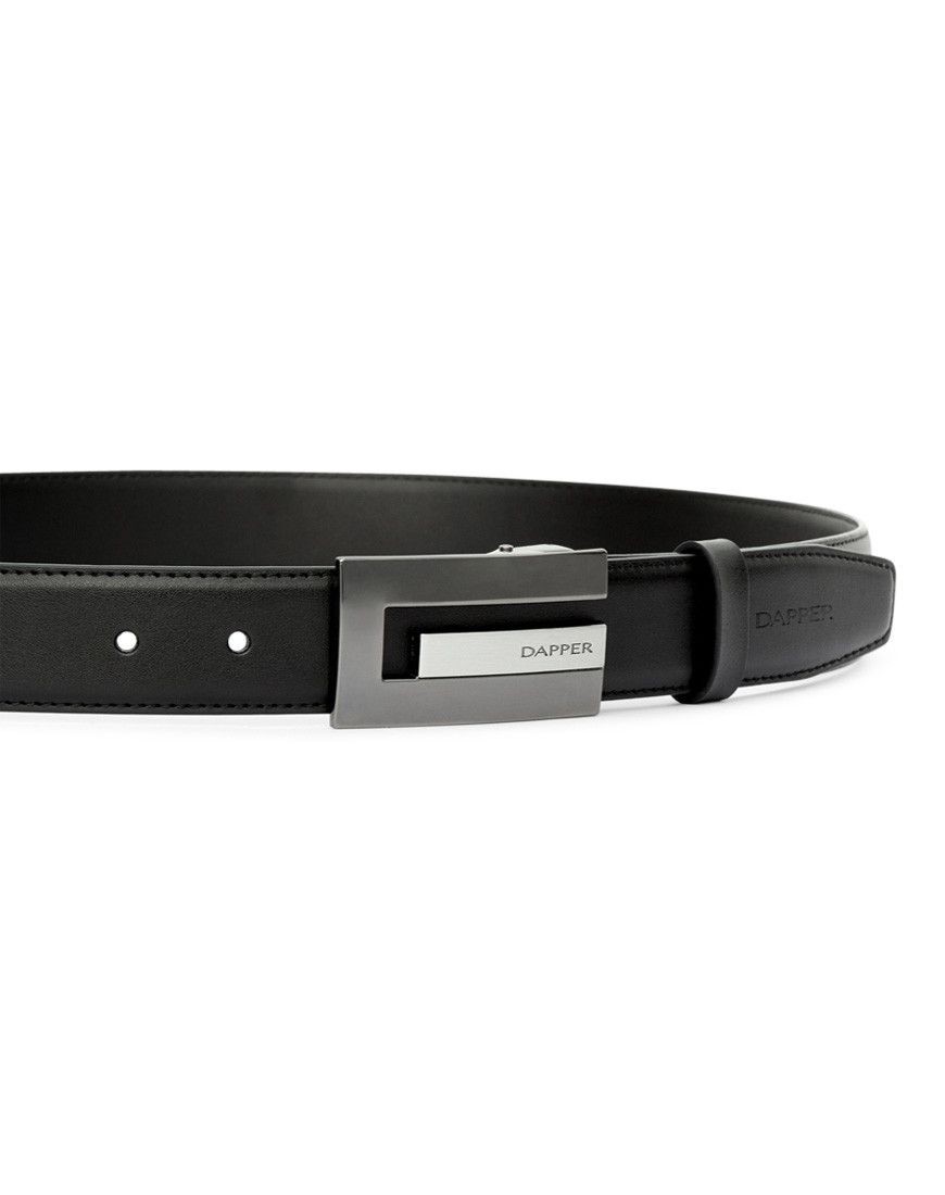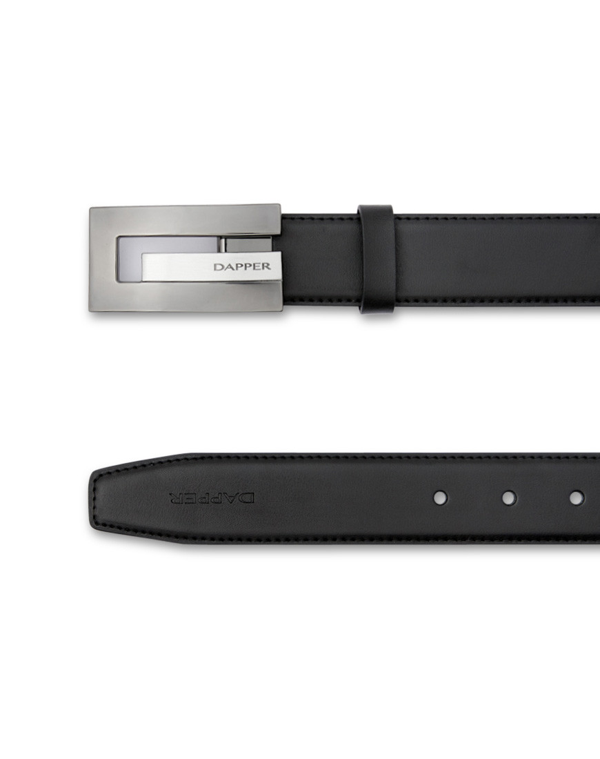 Brick Plaque Buckle belt made of Smooth leather in black leather with stitching around for strong & durable. Brick shape Buckle made of Zinc Alloy in Matte Gunmetal and Silver finishing with Engraved “DAPPER” logo. Leather strap can be cut to fit with Dapper logo debossed at the end of strap