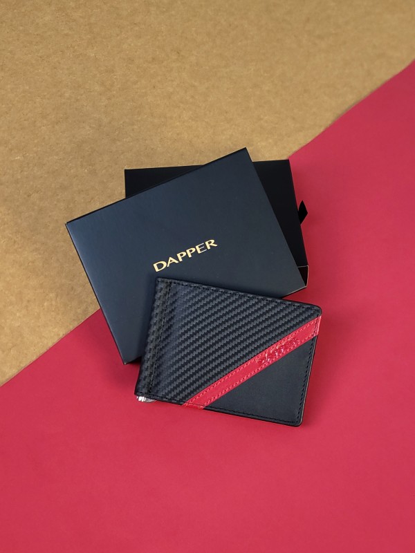 Carbon fiber Diagonal money clip wallet in black, red and Carbon fiber leather. with two inside pockets and six credit card slots Shiny Black metal clip for keep your bank note. Body made from genuine leather in black, red and Carbon fiber leather.