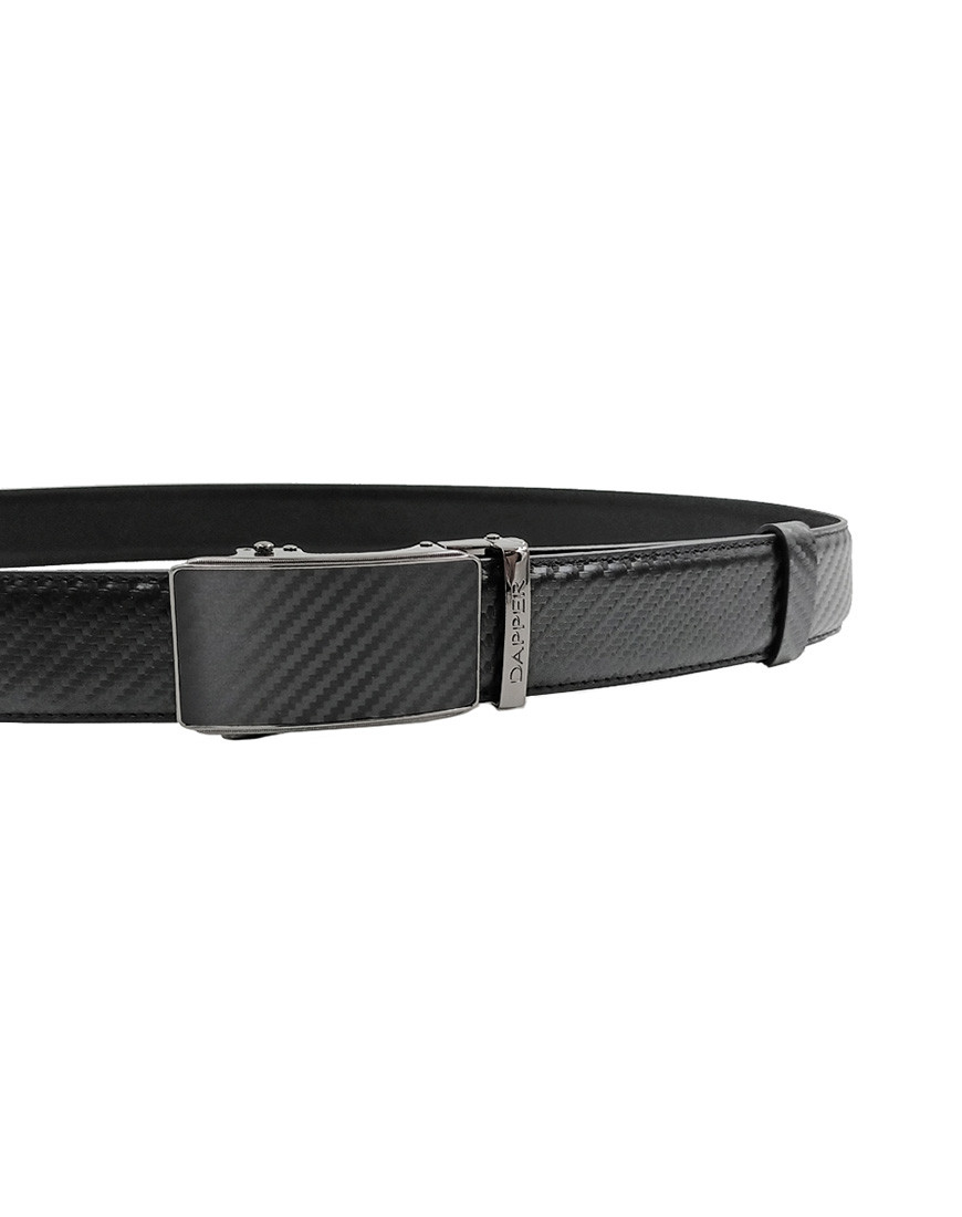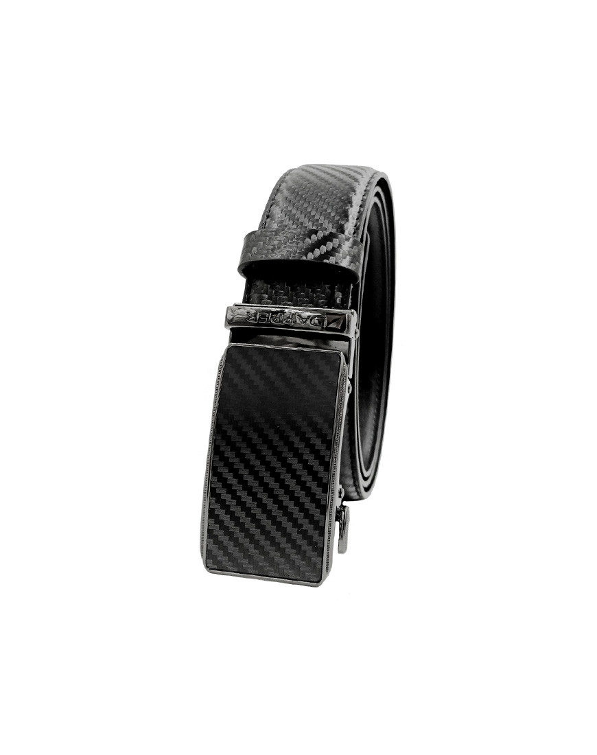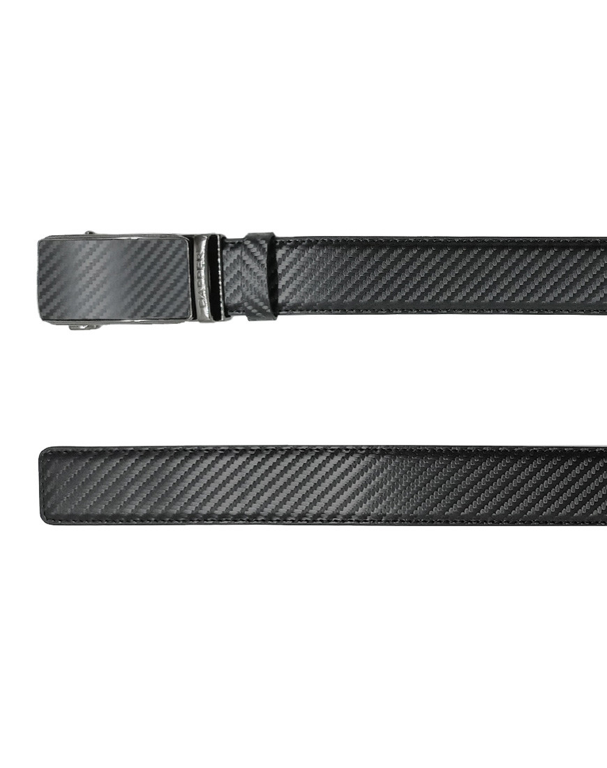 Easy removeable buckle allows you to cut the belt to your size. Slide in the strap to tighten & the belt with automatic locks. Lift the buckle & pull to release. Made of Carbon fiber genuine leather strip & modern Shiny Black with black Carbon Fiber inlay colour alloy buckle.