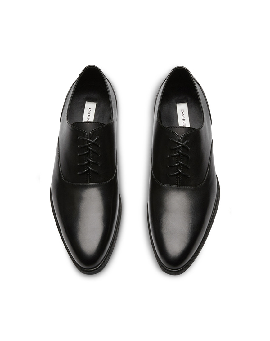 Classic Oxford dress shoes Smooth black leather Lace-up closure upper Leather sock & lining Soft & Non slippery D-Buckle Rubber outsole 1 inch.