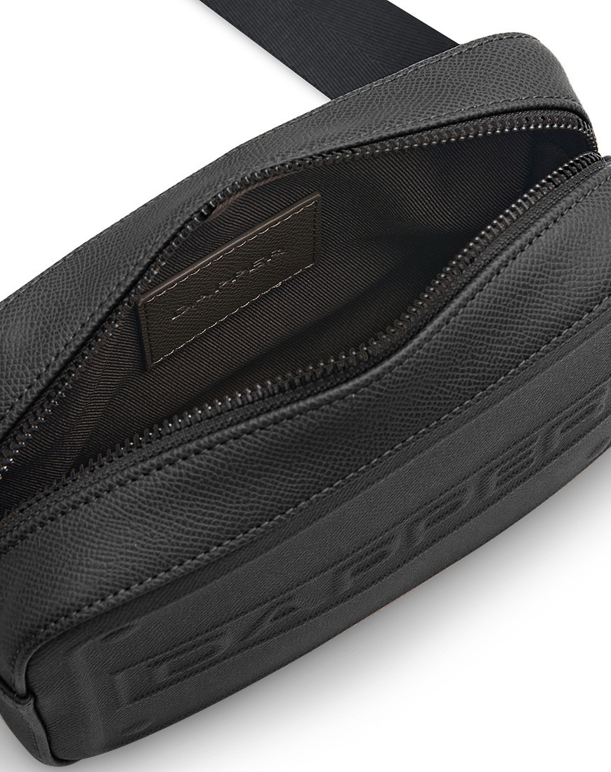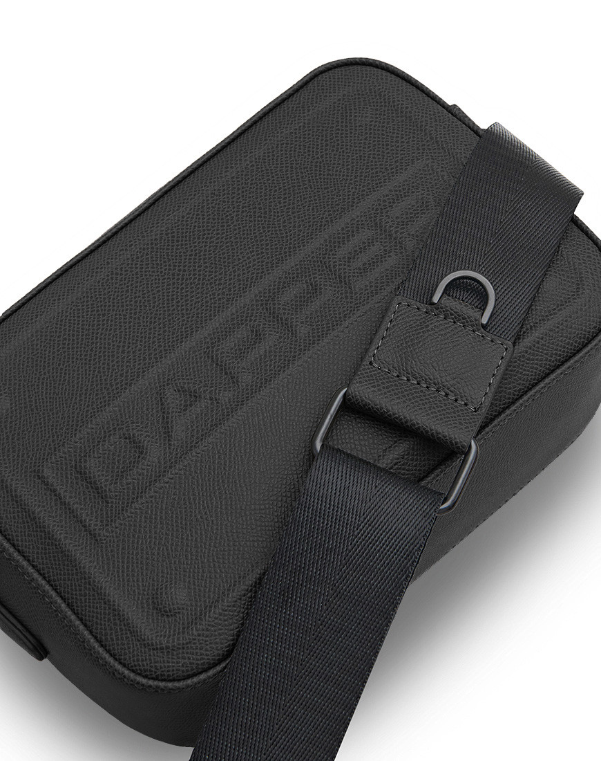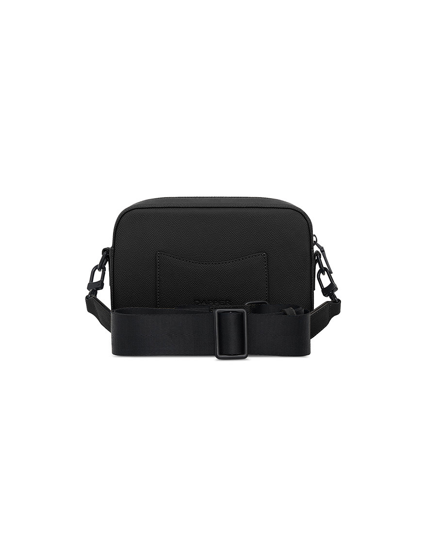 Boxy shape structured bag in smooth grain black PU with DAPPER logo embossed Featuring a detachable and adjustable shoulder strap, a top zip fastening a back has detachable 6 card slots pad in pocket main internal compartment and an internal zip pocket. Polished Matte Gun metal hardware