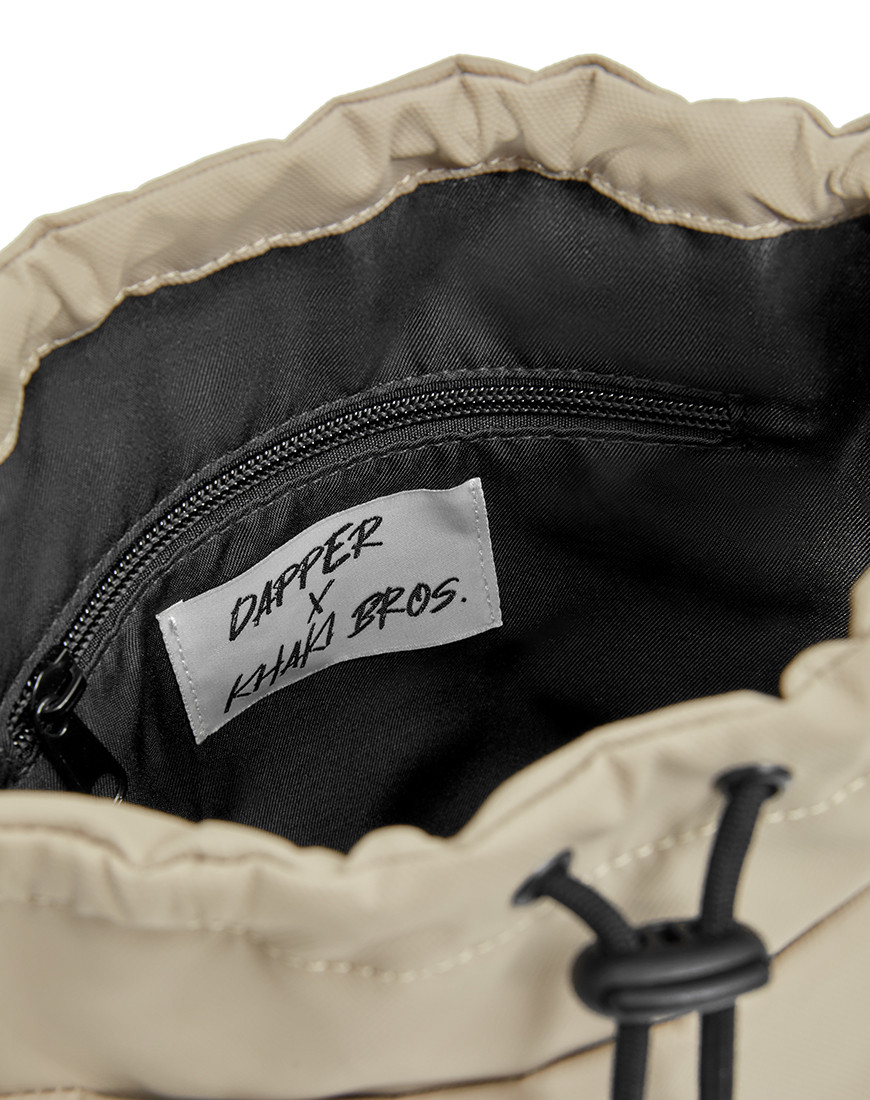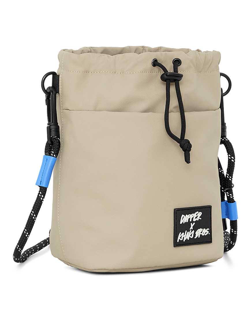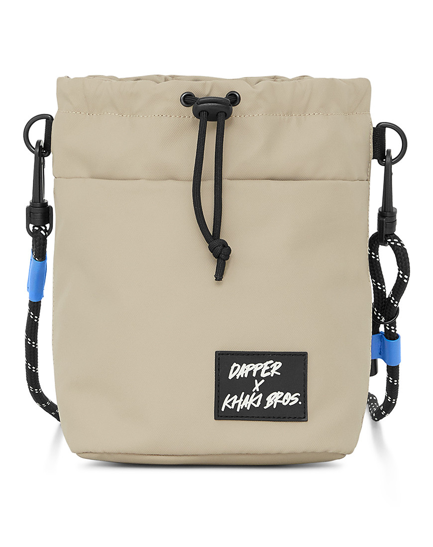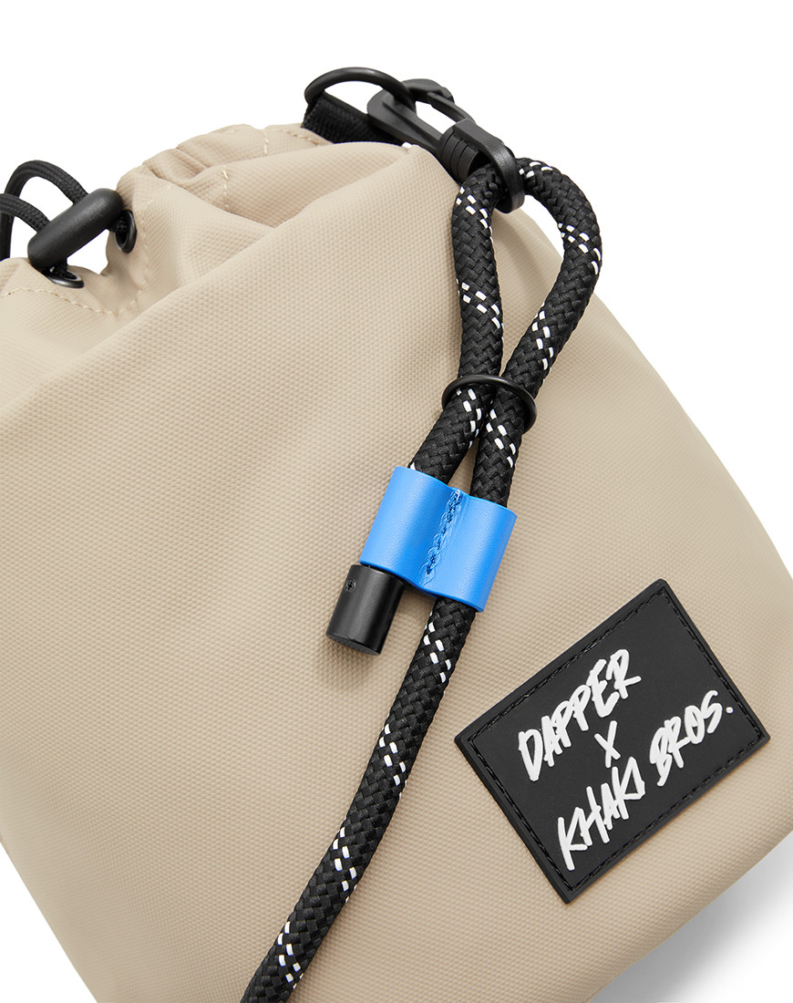 Dapper X Khaki Bros. Water Repellent Drawstring bucket bag with Matte khaki coating nylon twill fabric for the weather resistant Crossbody strap made of Black and White dot paracord rope inspired by Outdoor gear. Strap can detachable and adjustable DAPPER X KHAKI BROS black & white rubber badge at front part Decorated with Cobalt blue accent Lining Fabric & paracord stopper