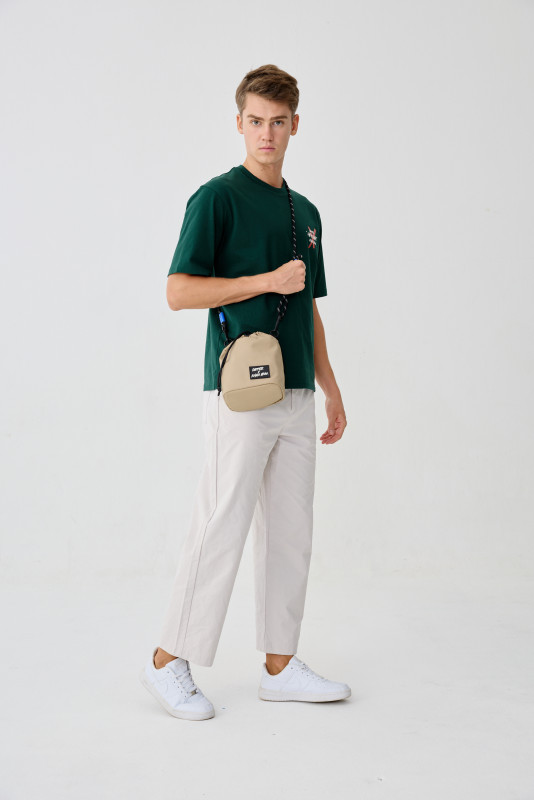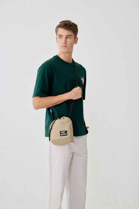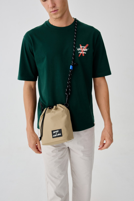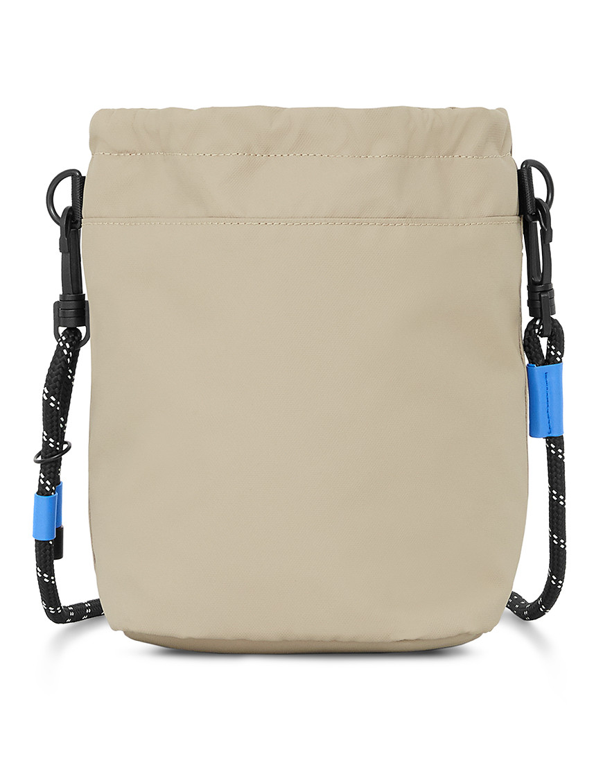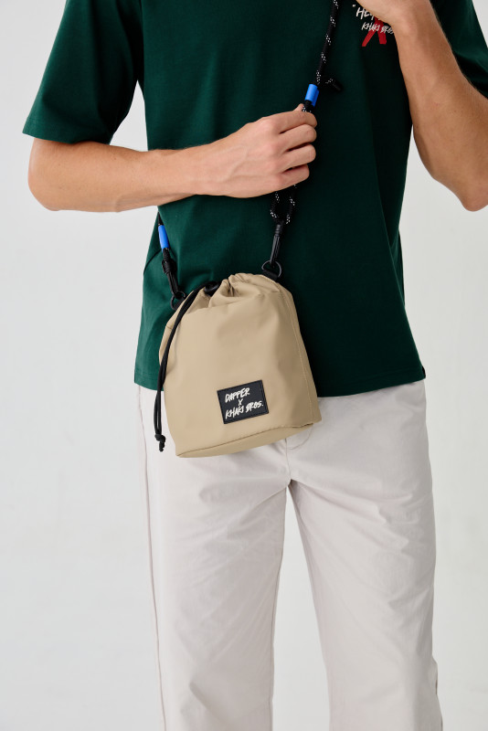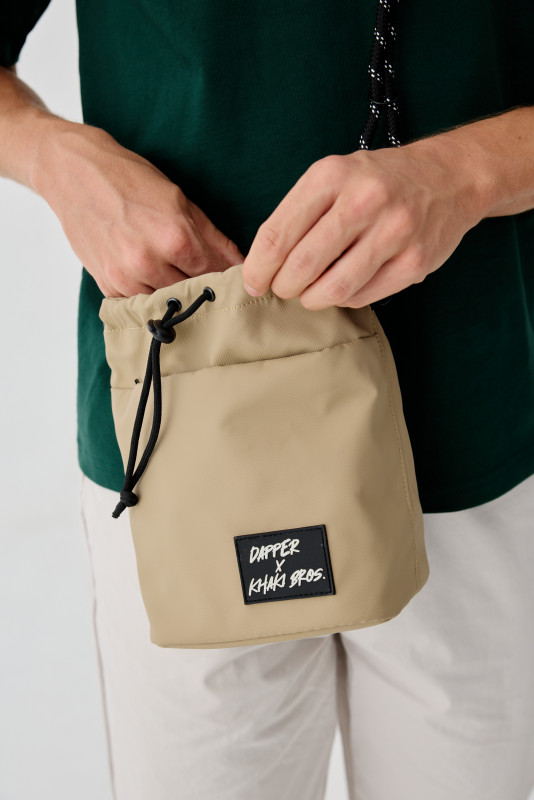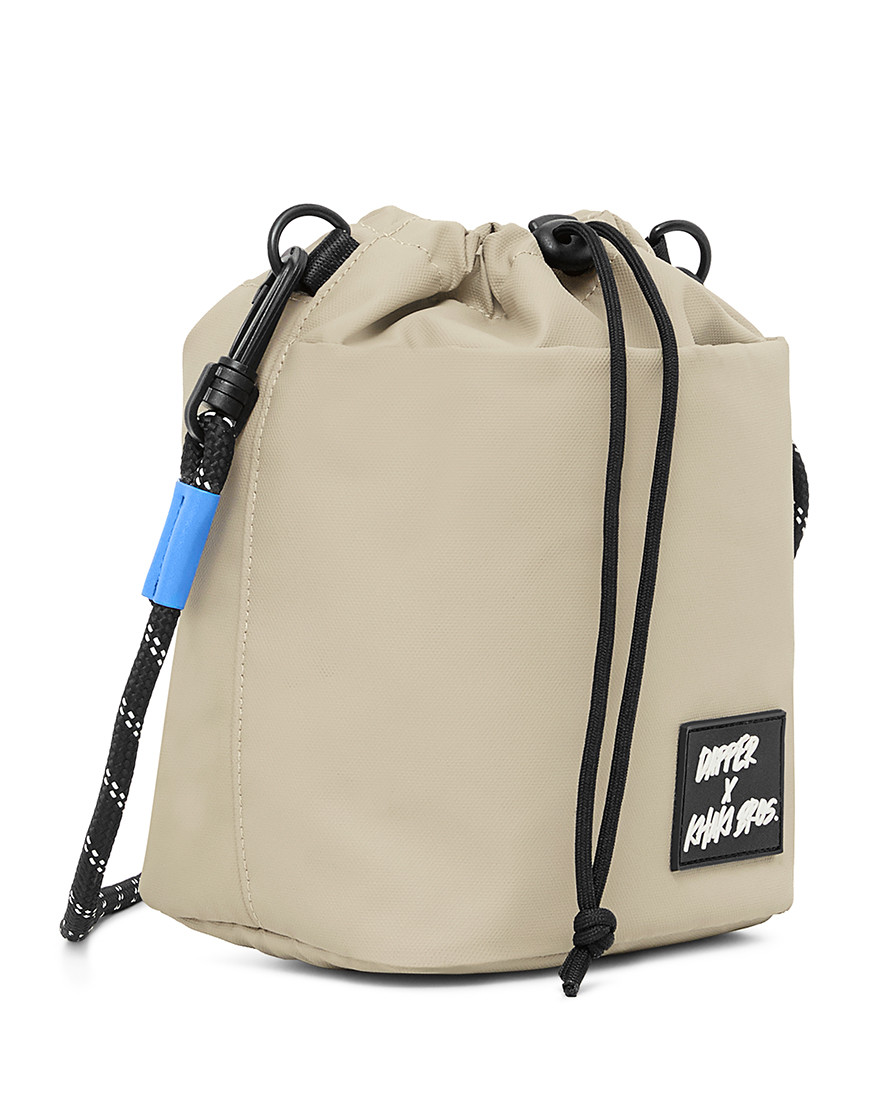 Dapper X Khaki Bros. Water Repellent Drawstring bucket bag with Matte khaki coating nylon twill fabric for the weather resistant Crossbody strap made of Black and White dot paracord rope inspired by Outdoor gear. Strap can detachable and adjustable DAPPER X KHAKI BROS black & white rubber badge at front part Decorated with Cobalt blue accent Lining Fabric & paracord stopper