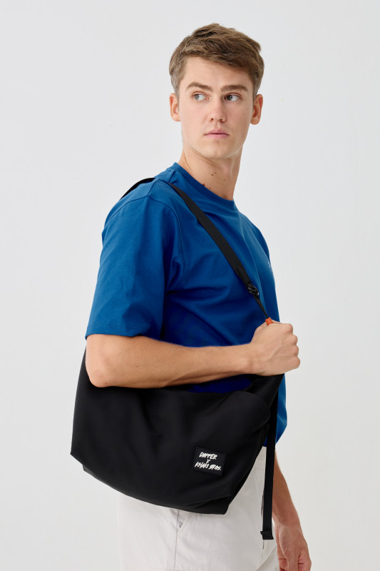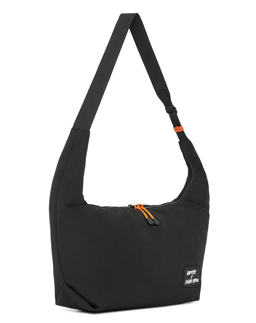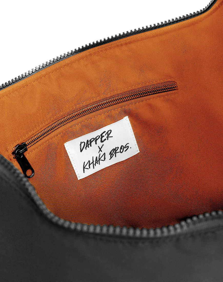 Dapper X Khaki Bros. Soft Ripstop Crossbody Bag made from Black soft ripstop fabric with a distinctive natural texture. Medium size bag suitable for carrying your everyday essentials. Wide Opening with double slide fasteners. Five pockets. including two slashed pockets on the outside perfect for water bottle and phone. Decorated with Orange accent Lining Fabric, zip puller and loop