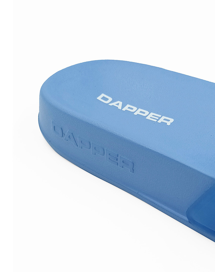 Pool Slide Sandals Made with PVC molded upper in Light Blue Embossed DP Icon in Transparent Soft Rubber / Water repellant match with Comfort cushioned footbed lightweight in blue DAPPER Molded Outsole