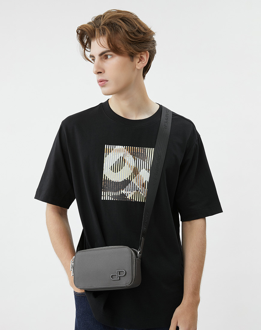 DP Iconic Boxy Crossbody bag is crafted from Grey Cross grain PU. Decorated with Matte Grey logo with Shiny Silver hardware. Comfortable to carry, thanks to its adjustable logo strap, it opens to reveal a gusseted interior large enough to hold two phones as well as cash, cards and other small essentials. 2 outside zipped pockets 2 inside flat pockets, 6 cars slots. This Crossbody is Wearable wallet