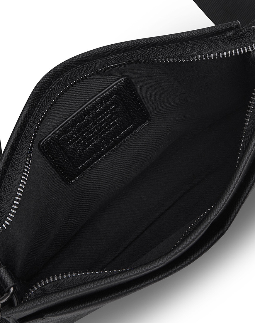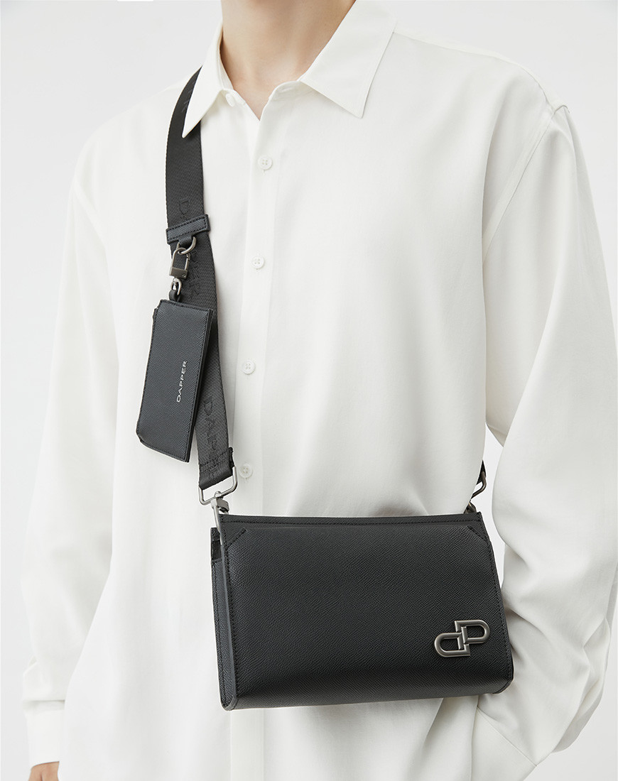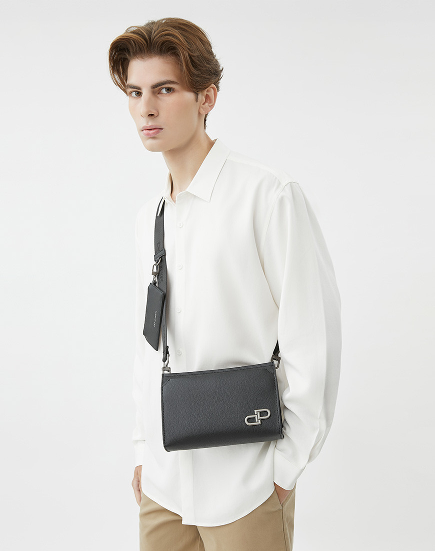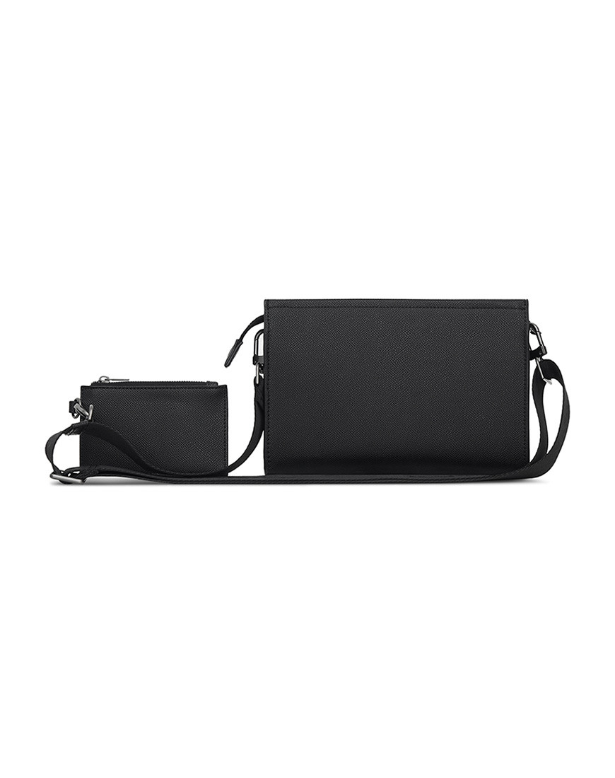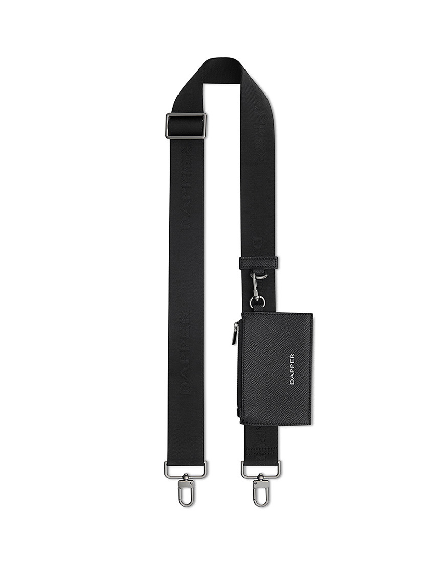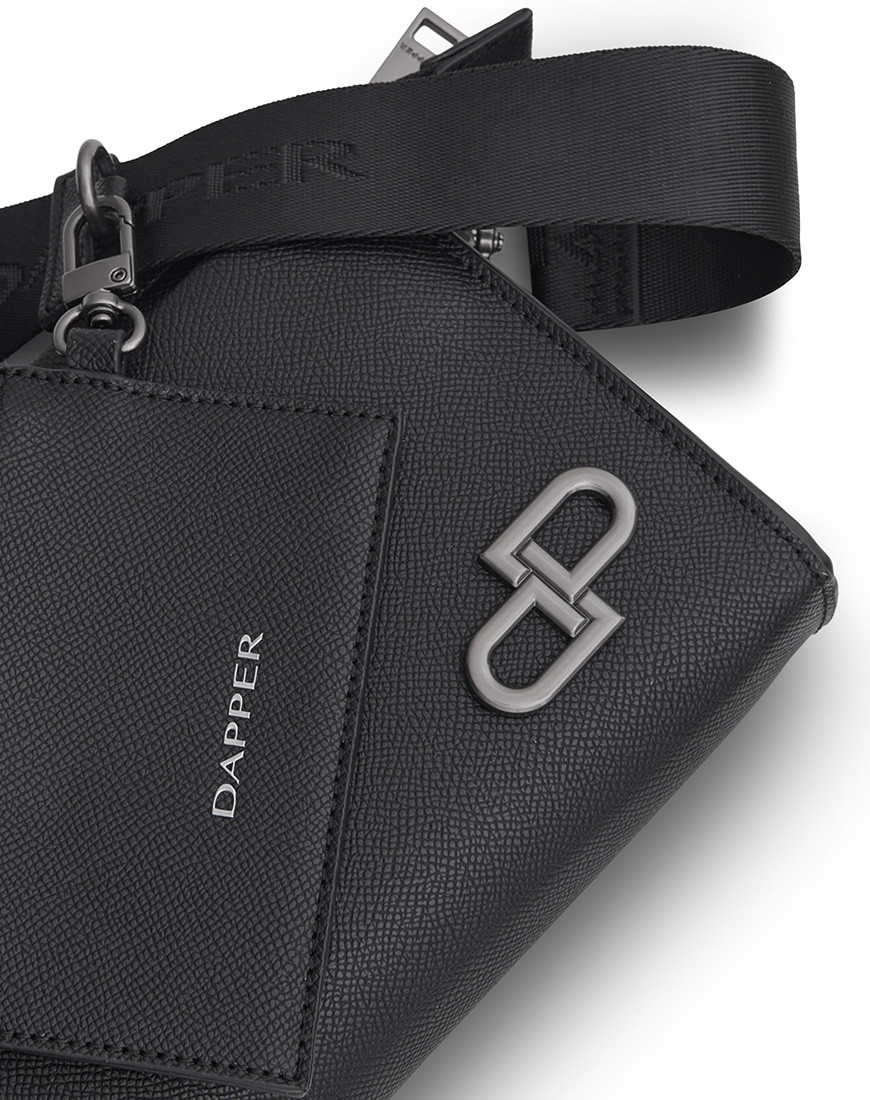 DP Icon Pochette bag with Detachable card holder is crafted from Black Cross grain PU. Decorated with Gun metal logo with matching hardware. This bag is perfect size for everyday essentials such as a smart phone. Removable and adjustable logo strap with a detachable card holder attached to it, Ideal for contactless payment or commute card. Gun metal main zip pocket matching with zipped card holder.