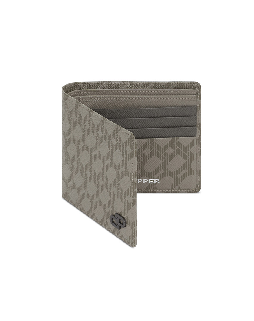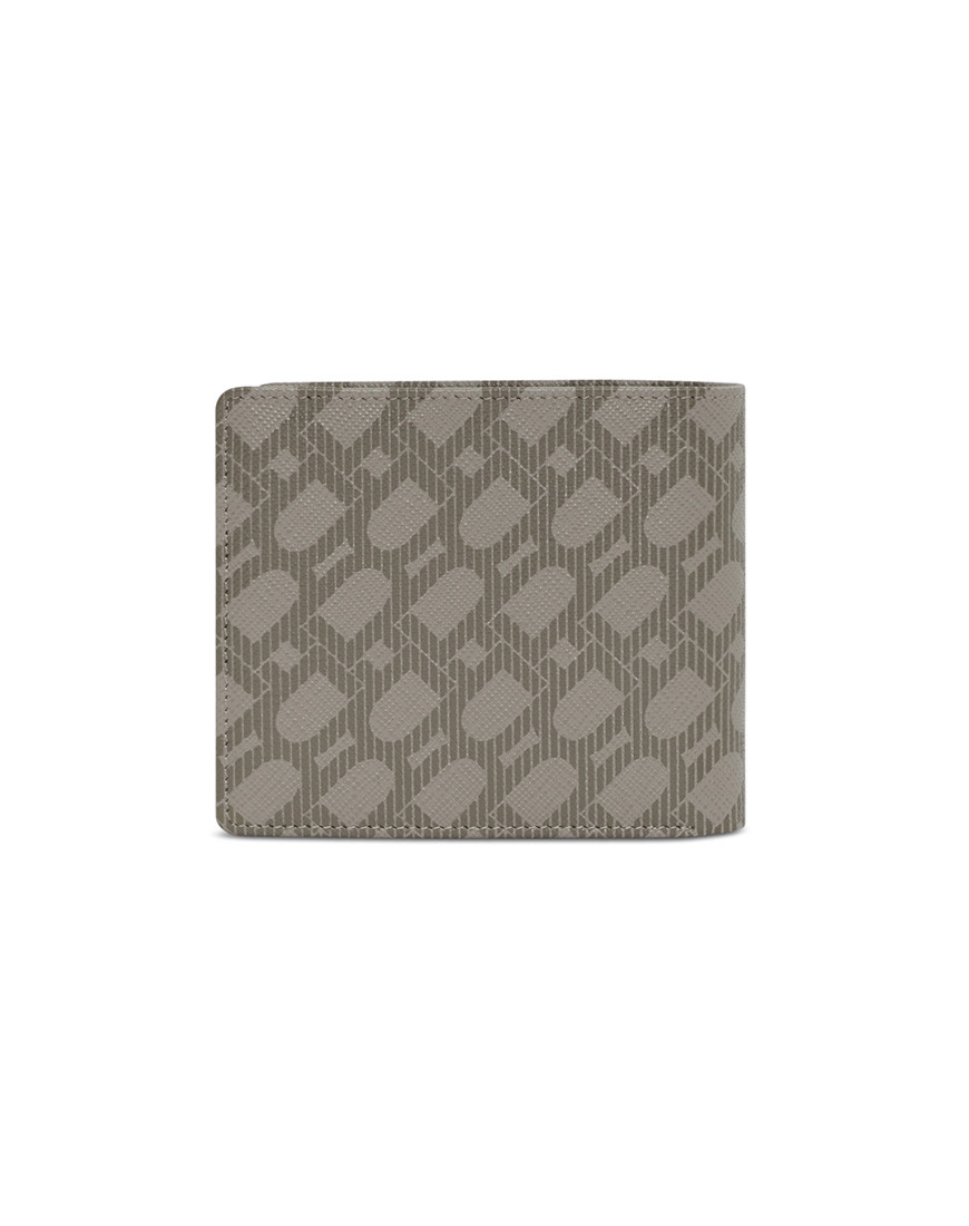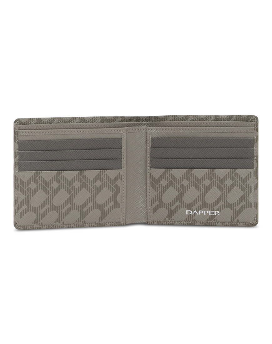 This elegant Cross Grain leather wallet is decorated with a DP logo Interlock monogram in Taupe (Beige/Brown) with metal logo at corner. pockets two bill compartment Eight card slots in contrast colours inside (Mid Grey) Minimal tone.
