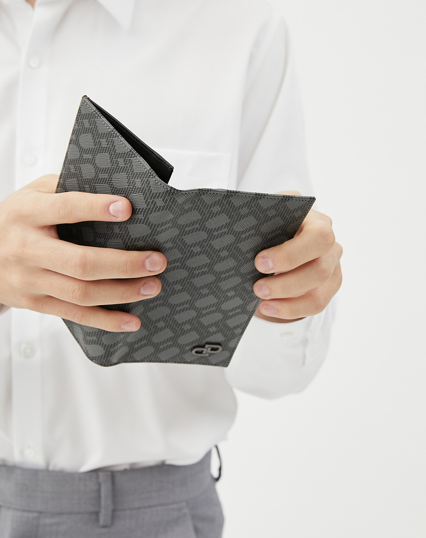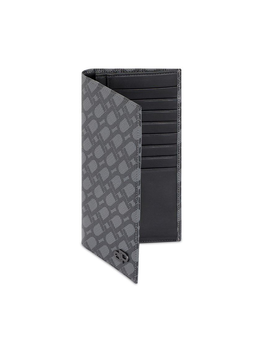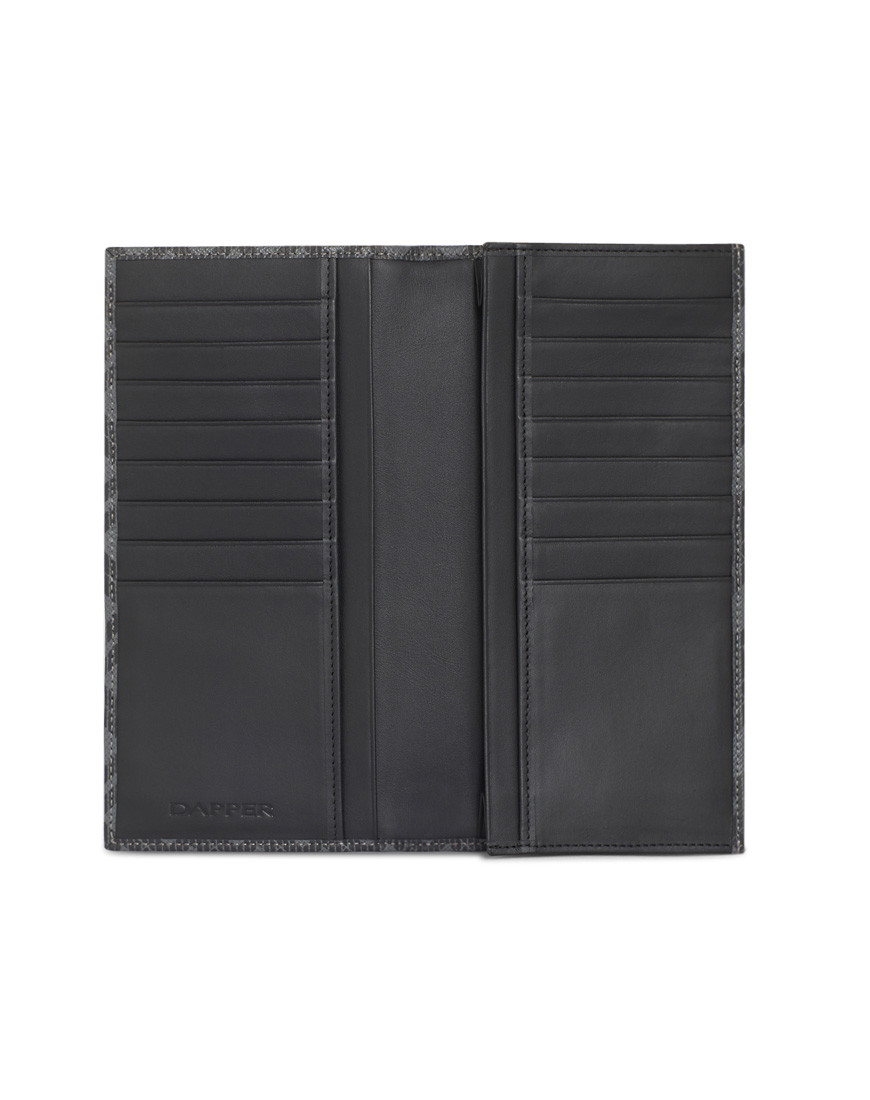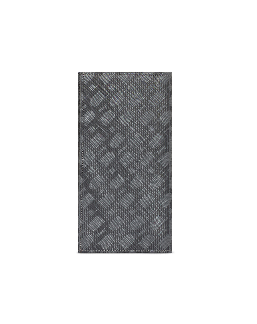 DP Interlock Monogram Breast Pocket wallet Designed to fit perfectly inside the pocket of an suit or blazer, this wallet is crafted in Grey & black monogram printed Leather, Complete with 16 card slot 3 full-lenght bill and zip coin pocket