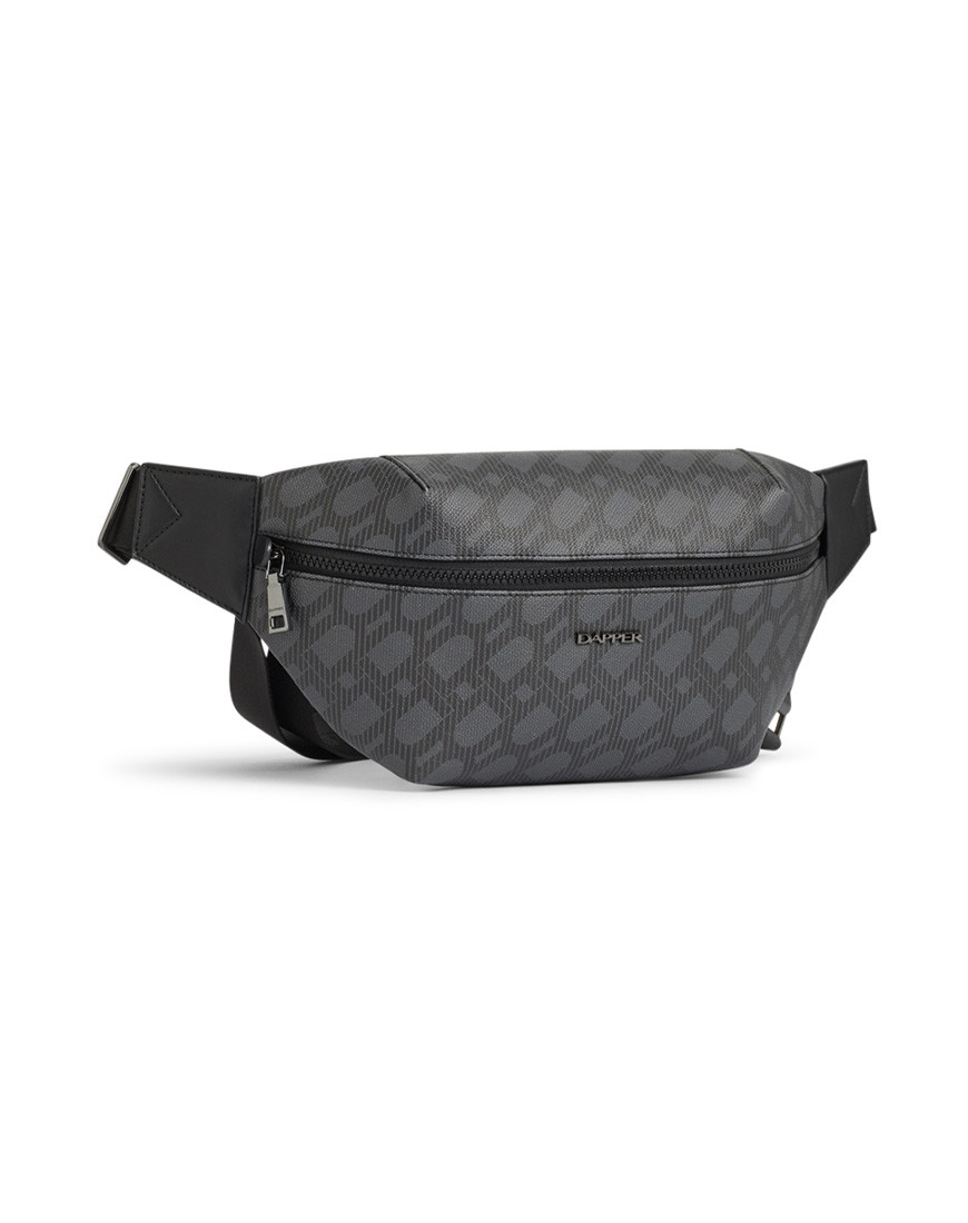 DP Interlock Monogram belt bag, crafted in grey cross grain with DP interlock monogram printed in black match with black smooth faux leather, shiny black hardware, Black webbing strap with Dapper logo. front smooth plastic zip fastening, a back nylon zip pocket for secured items. one slip pocket and zipper pocket inside, Gun metal Dapper logo & accessories. adjustable buckle