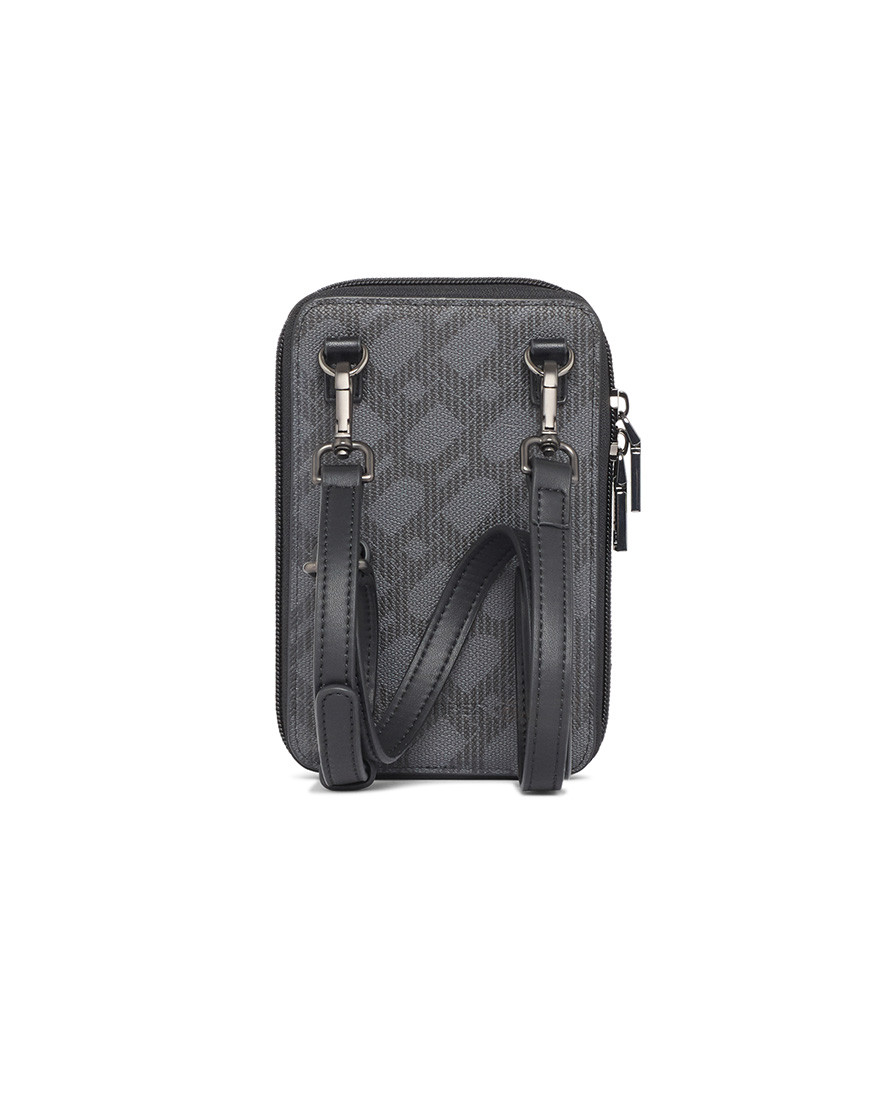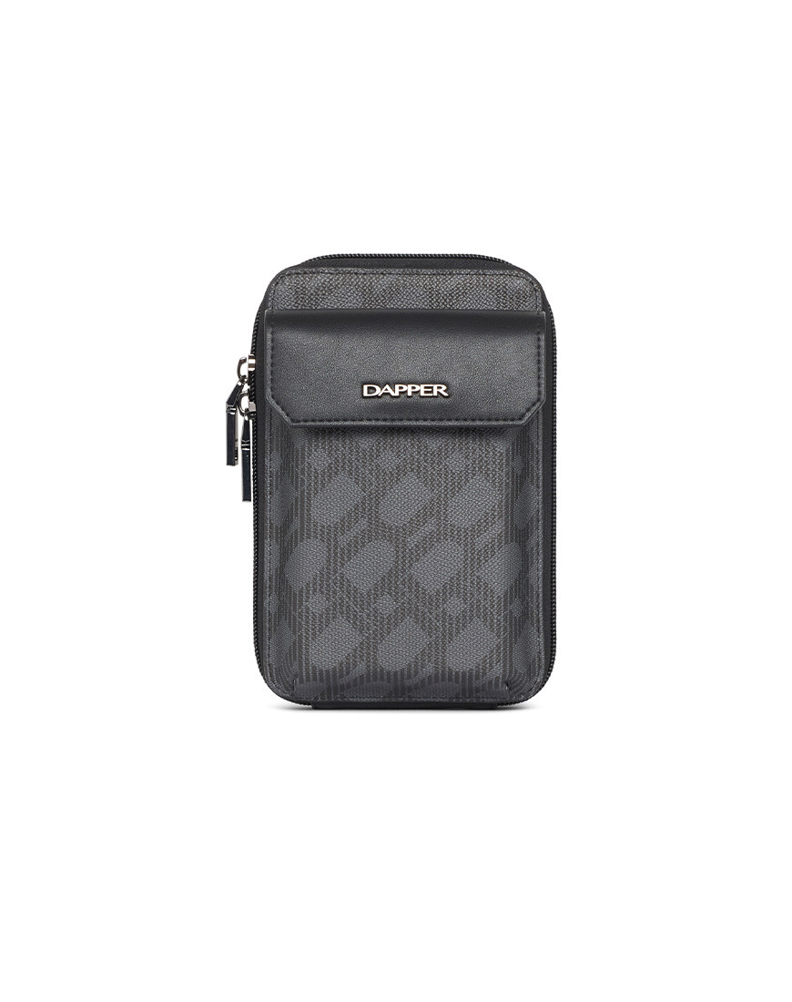 Crossbody Phone Pouch is all about low-key elegance. The gusseted main compartment opens wide for easy access to a mobile phone and other belongings supplemented by a front flap pocket Adjustable strap for hand-free carry Black metal hardware match with DAPPER logo in front of flap pocket. Grey cross grain with DP interlock monogram printed in black match with black PU