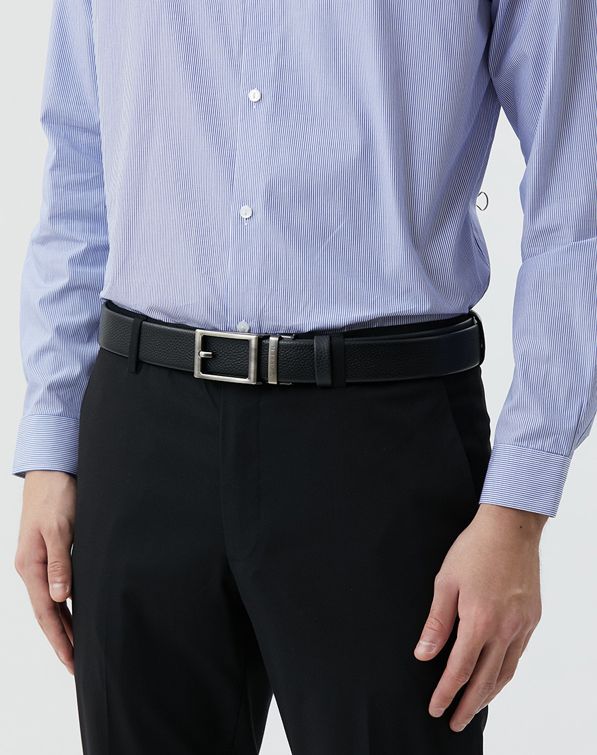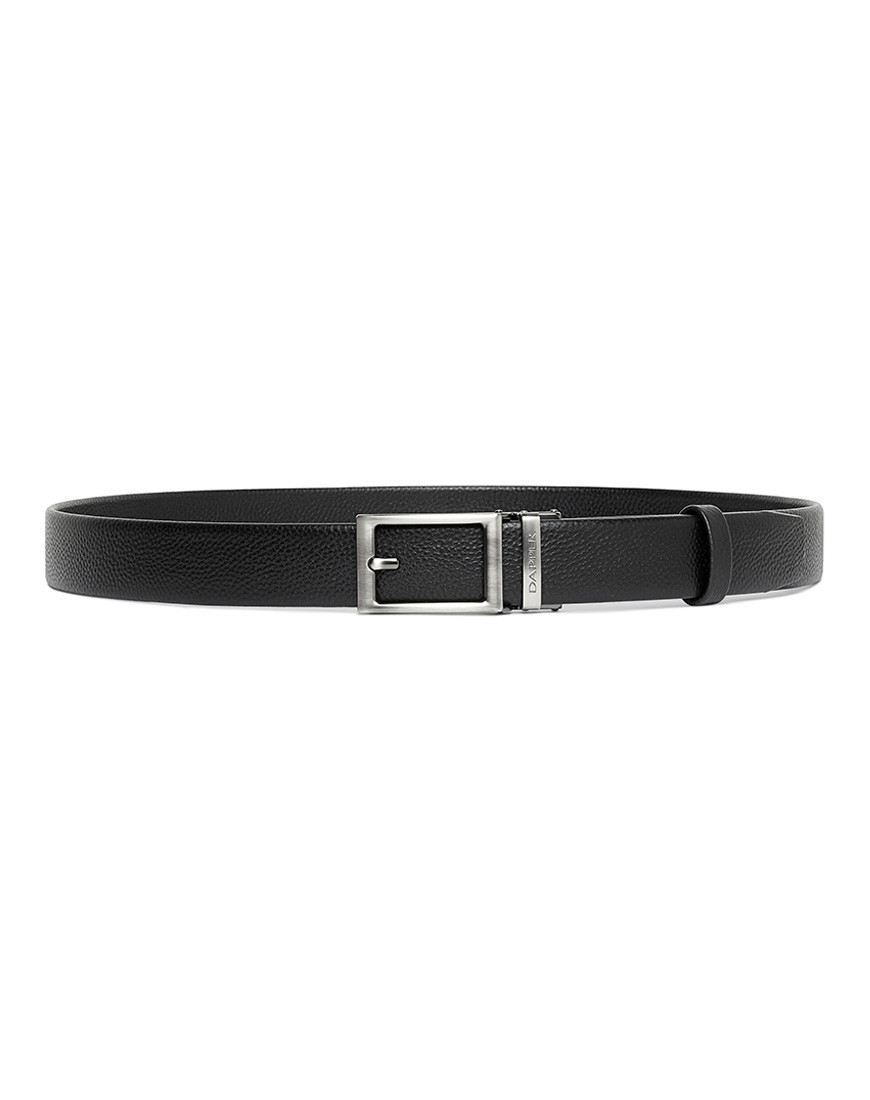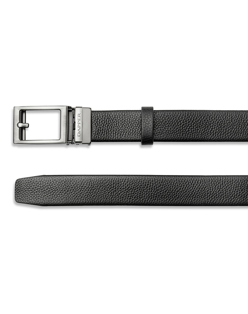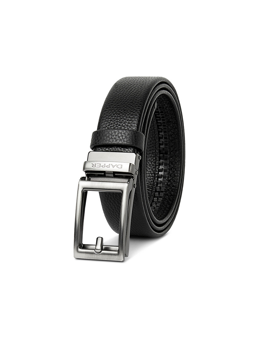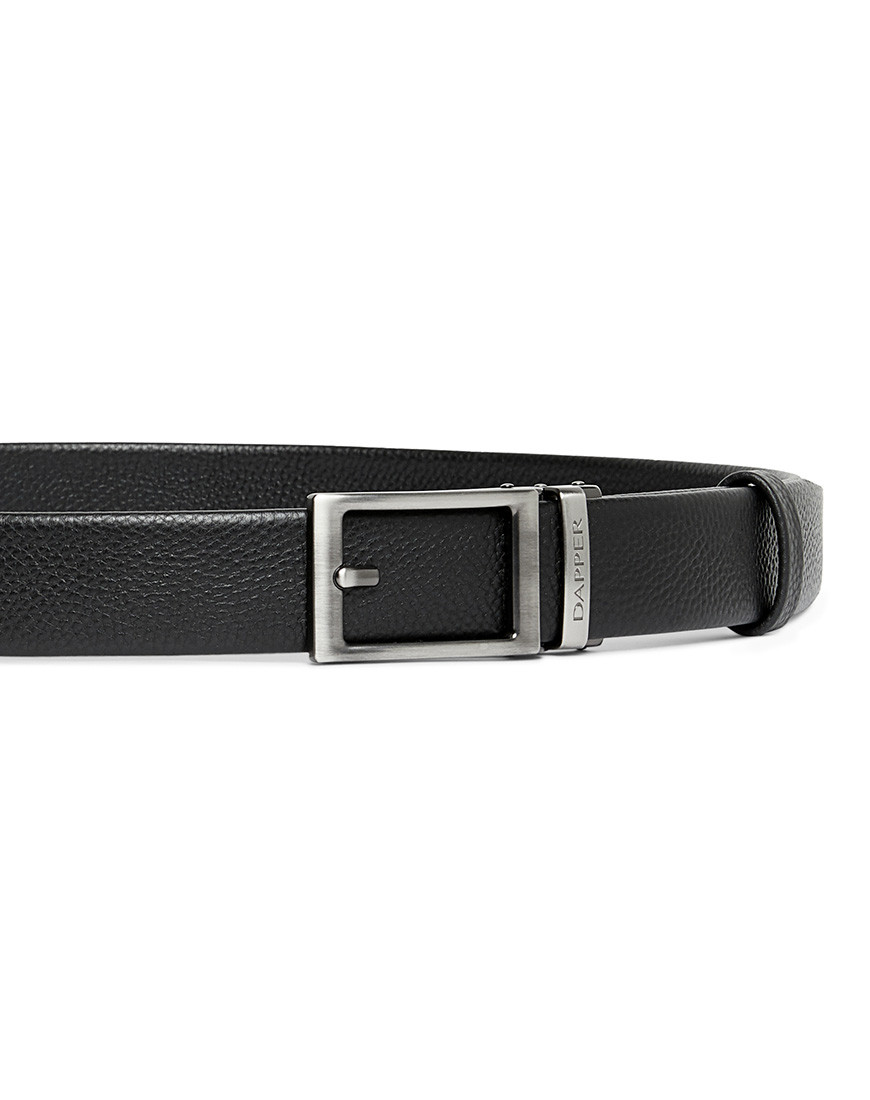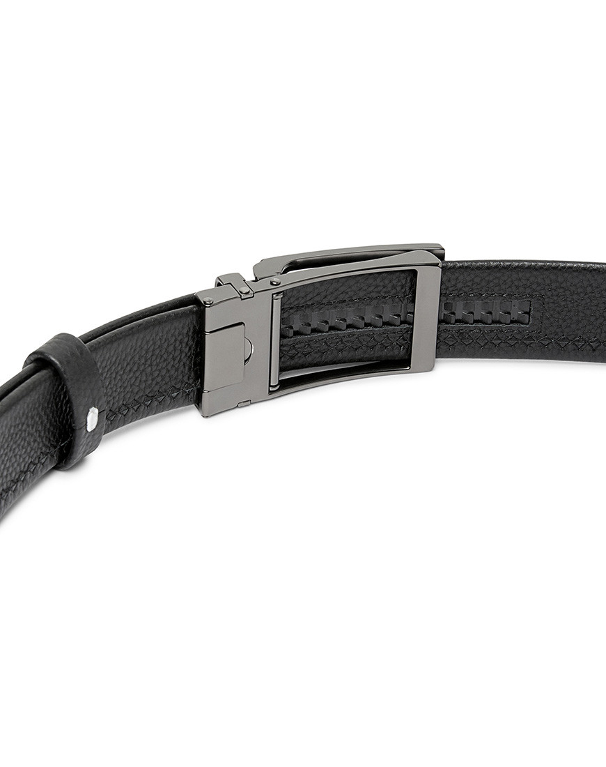 eather Ratchet belt with Automatic click buckle made of Black Soft Pebbled grain texture genuine leather strap with Hidden back stitched. Buckle made of Zinc Alloy in Modern Brushed Gun metal finishing. Buckle look like Pin buckle but easy to tighten or loose Lift the buckle & pull to release.