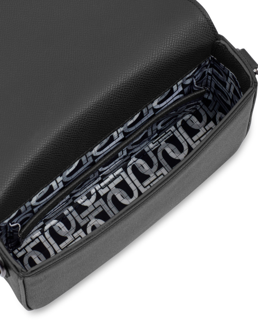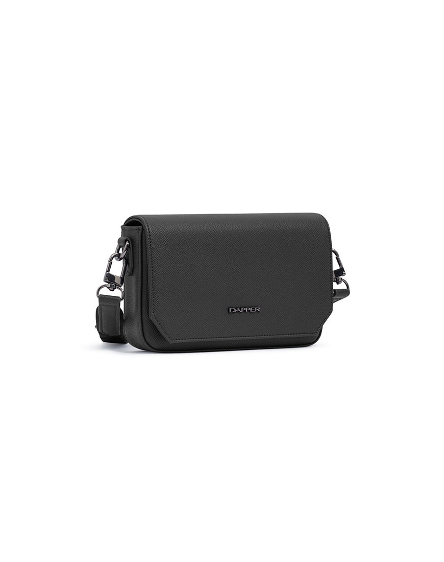 Dapper Mini Crossbody bag with DP interlock monogram lining The bag is minimalist design asserts a maximum of sleek style. Crafted with Black Faux leather soft touch Protected by a flap with precision-cut corners it’s ideal for carrying a mobile phone match with Antistatic DP interlock monogram printed lining. Detachable shoulder strap. back part has easycard pocket