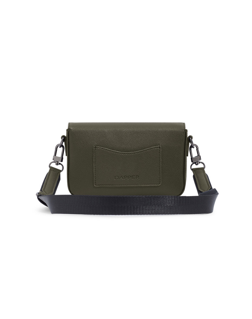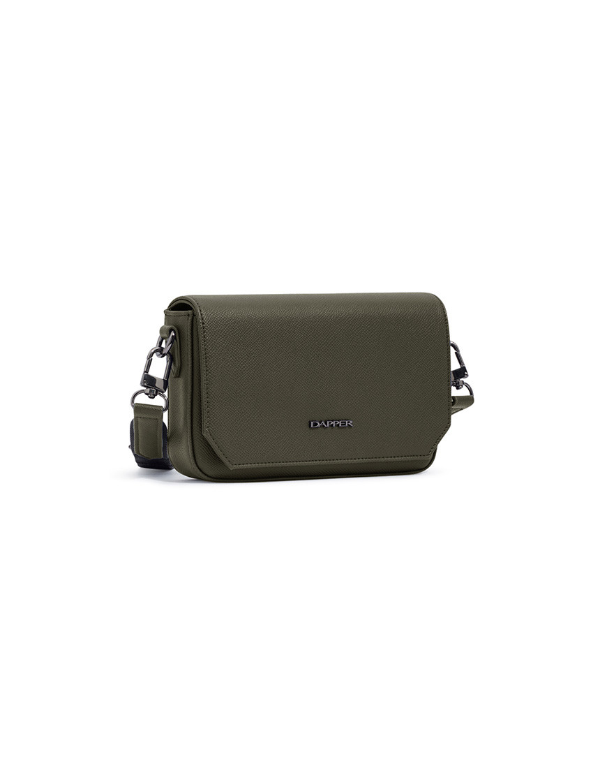 Dapper Mini Crossbody bag with DP interlock monogram lining The bag is minimalist design asserts a maximum of sleek style. Crafted with Olive Cross grain Faux leather Protected by a flap with precision-cut corners it’s ideal for carrying a mobile phone match with Antistatic DP interlock monogram printed lining. Detachable shoulder strap. back part has easycard pocket