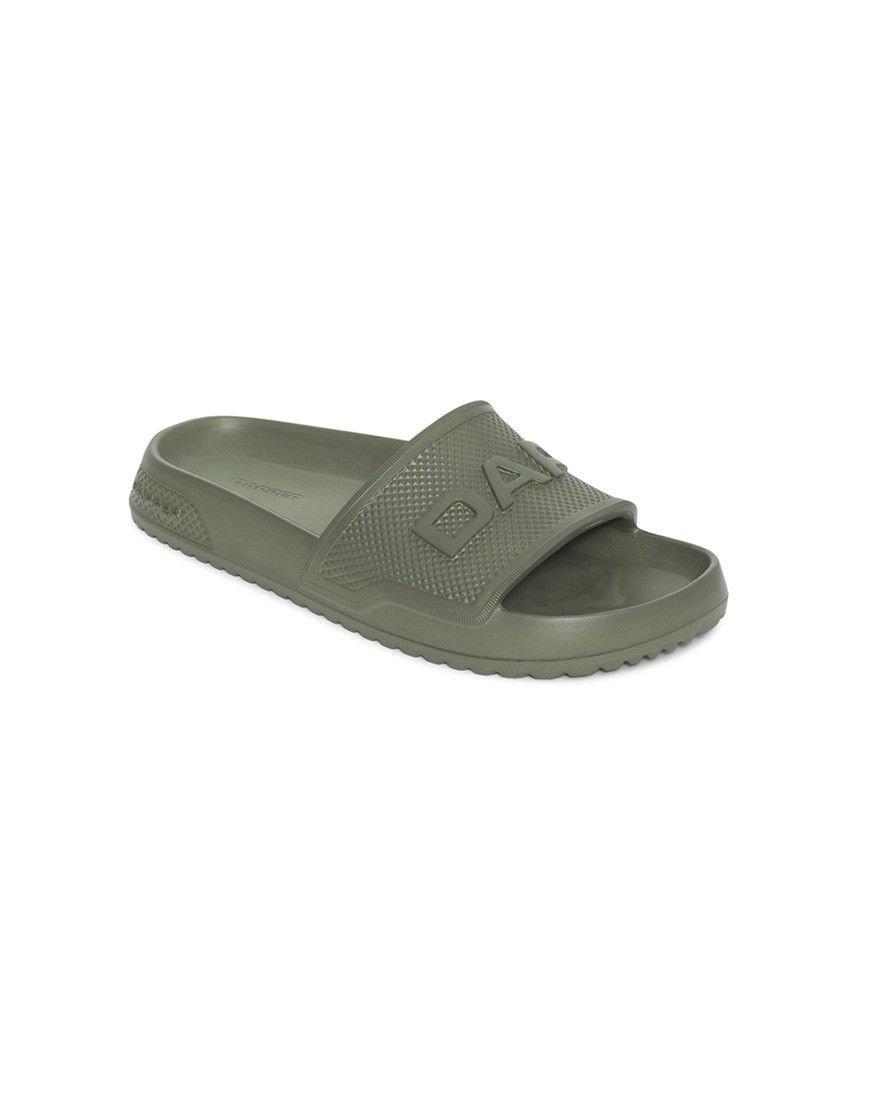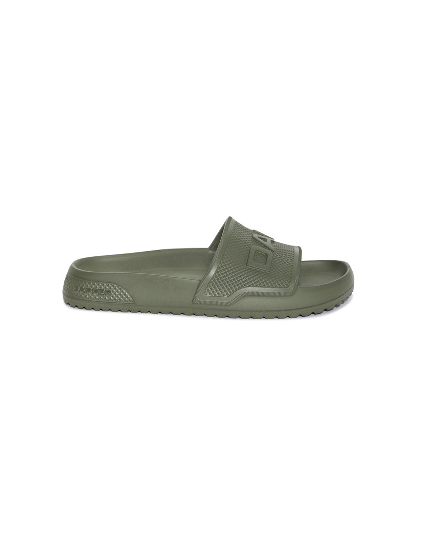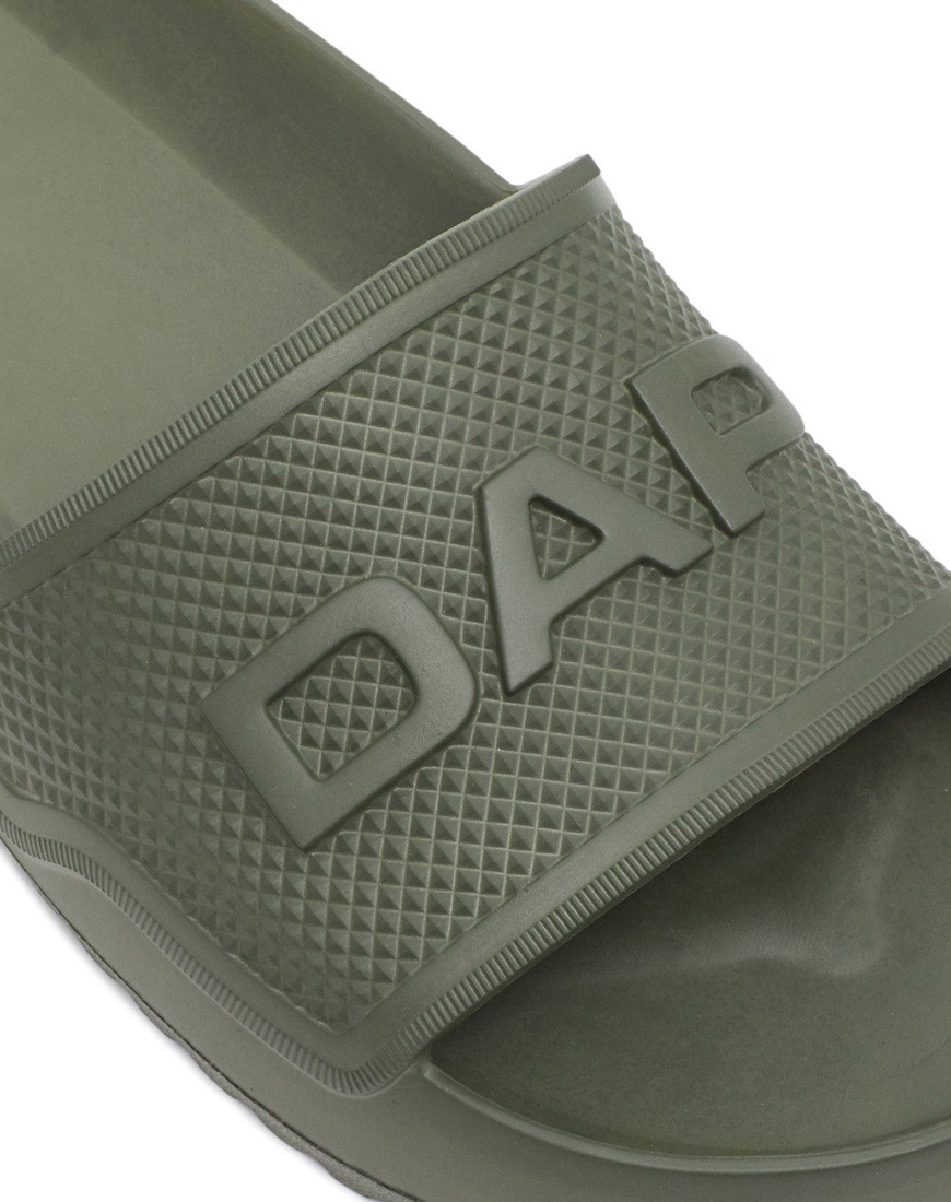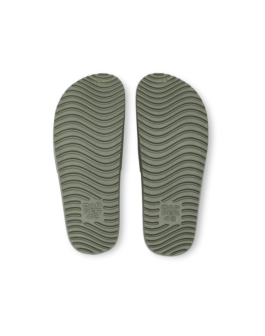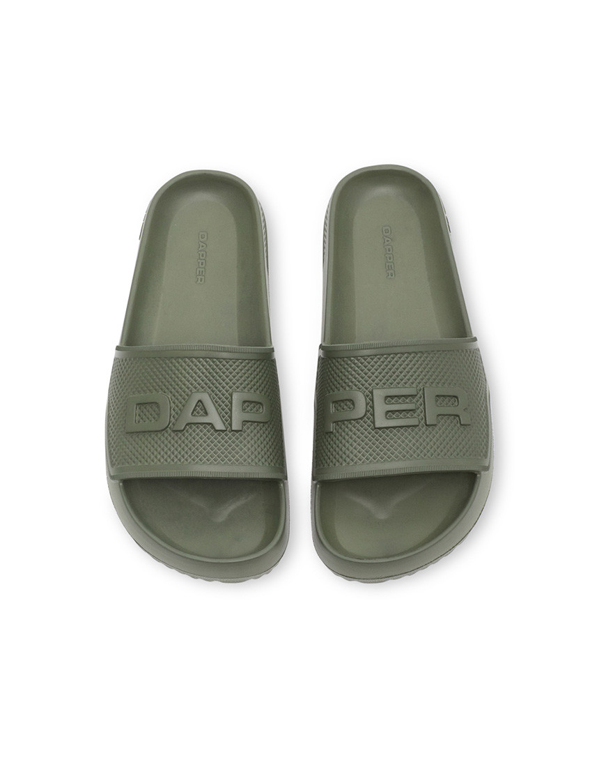 DAPPER monochrome pool slide sandals. Chunky rubber sole and wide strap across the instep. DAP and PER typo embossed Textured detail on the instep and heel. This sandals made from 100% injection molded EVA in green. water-resistant and flexible