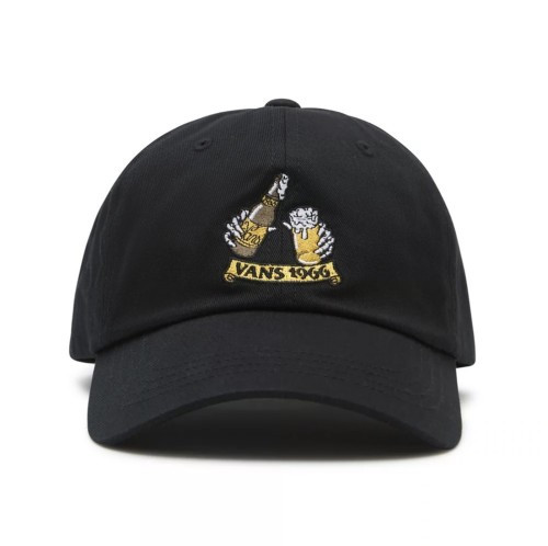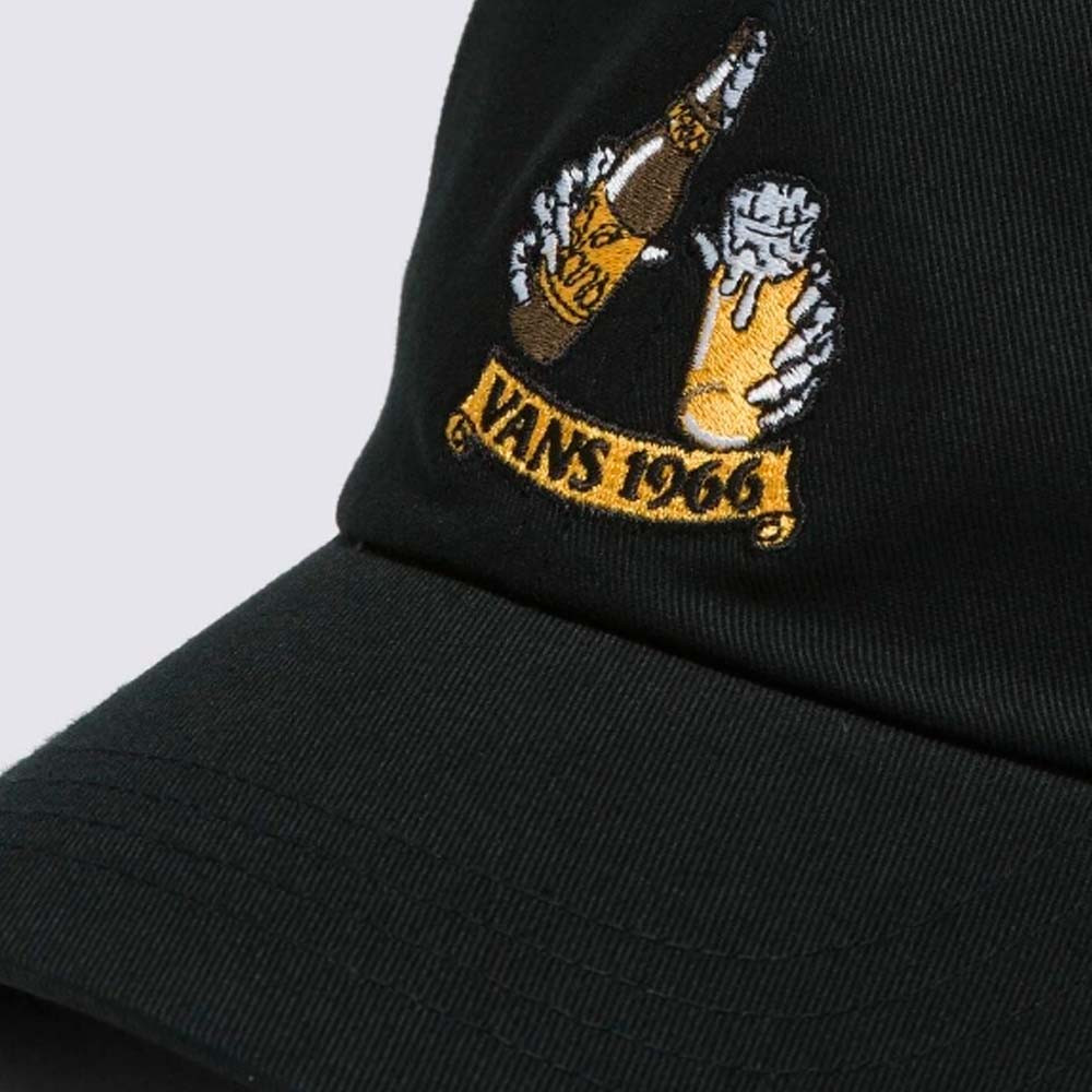 The Vans Cold Crew Curved Bill Jockey Hat has 6 panels and the Vans logo with imagery on the front. It has an adjustable back.