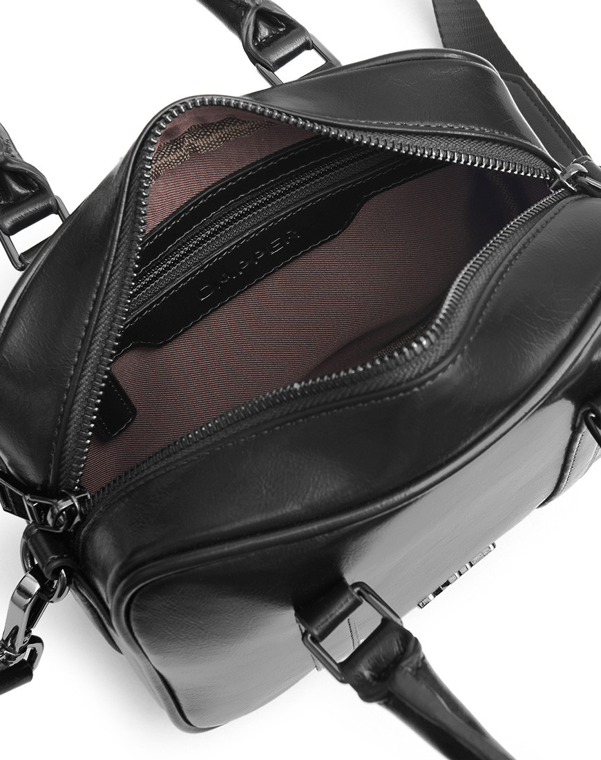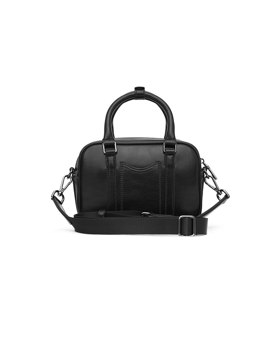 Top Handle Crossbody in Wrinkle-Effect Faux Leather in black Which features insert vertical card pocket on the back panel. Main compartment with shiny metal zip closure. One is slip pocket inside Other side with nylon zip pocket. Polished shiny black metal logo & other hardware. Detachable and removable shoulder strap with mini D-ring for Attached key ring. Top handle with Snap button