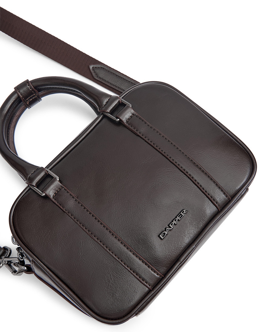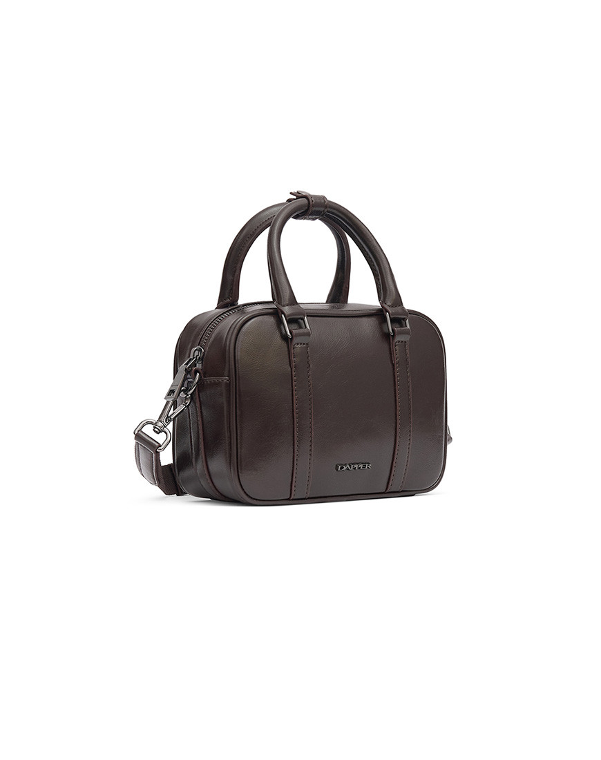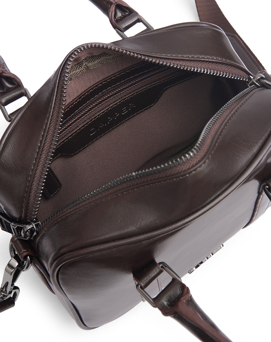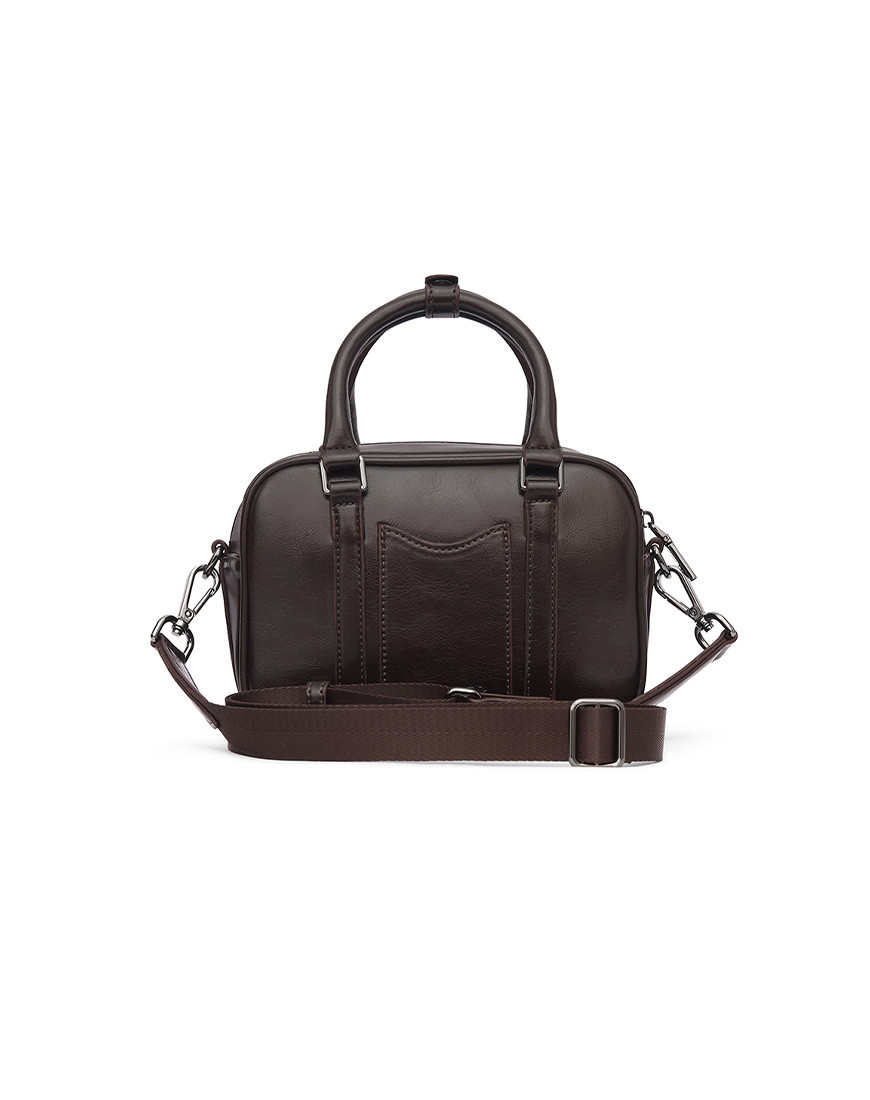 Top Handle Crossbody in Wrinkle-Effect Faux Leather in brown Which features insert vertical card pocket on the back panel. Main compartment with shiny metal zip closure. One is slip pocket inside Other side with nylon zip pocket. Polished shiny black metal logo & other hardware. Detachable and removable shoulder strap with mini D-ring for Attached key ring. Top handle with Snap button
