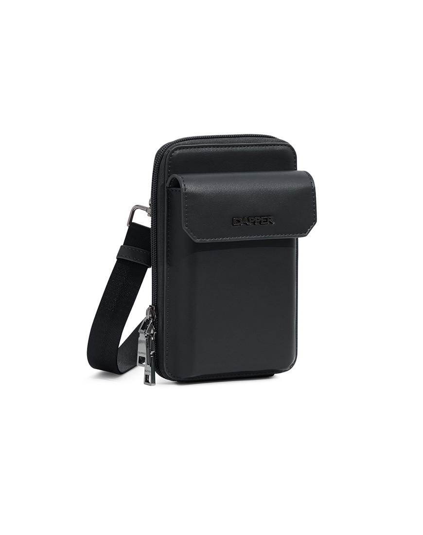 Crossbody Phone Pouch is all about low-key elegance. The gusseted main compartment opens wide for easy access to a mobile phone and other belongings supplemented by a front flap pocket. adjustable strap for hand-free carry. Black metal hardware match with Dapper logo in front of flap pocket. Smooth black PU with Nylon zipper friendly with phone and other gadgets