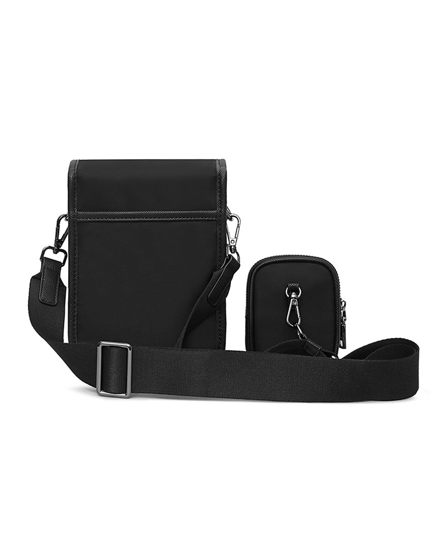 DAPPER Flap crossbody bag with Detachable mini pouch, This flap bag combines Cross grain faux leather and Smooth Nylon fabric with Dapper shiny black metal emblem on front part. External flap pocket with shiny black side-release buckle match with zip puller, D-ring, Dogleash and Adjustable square ring. Monochrome colour in black easy to match with modern style. Mini pouch with metal snap hook.
