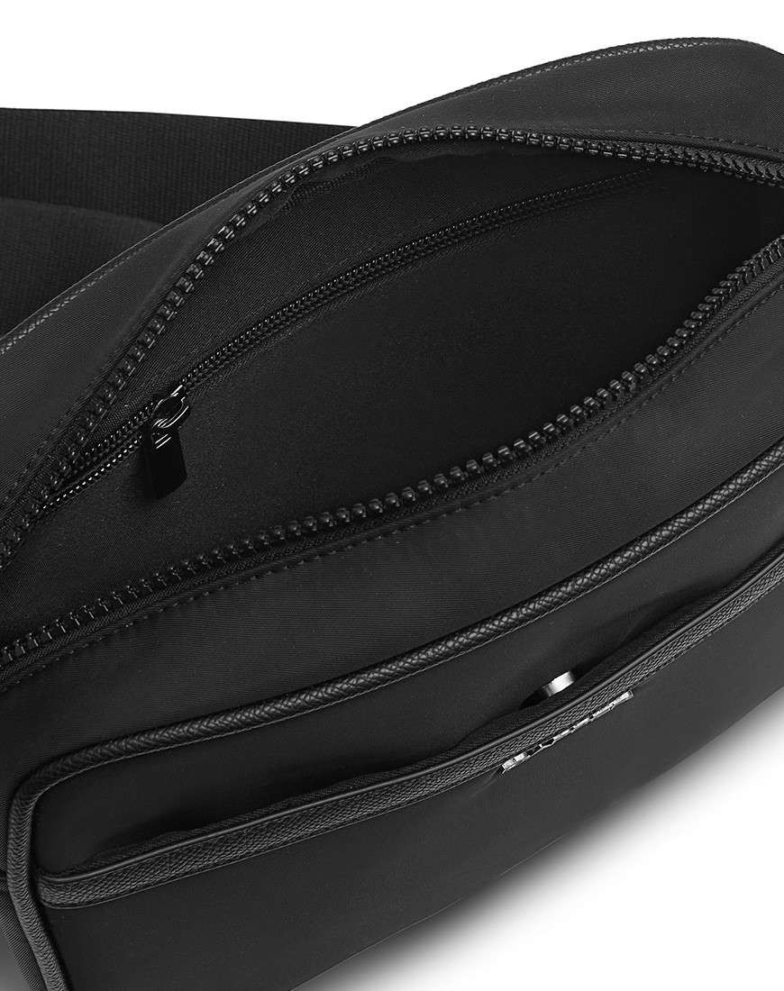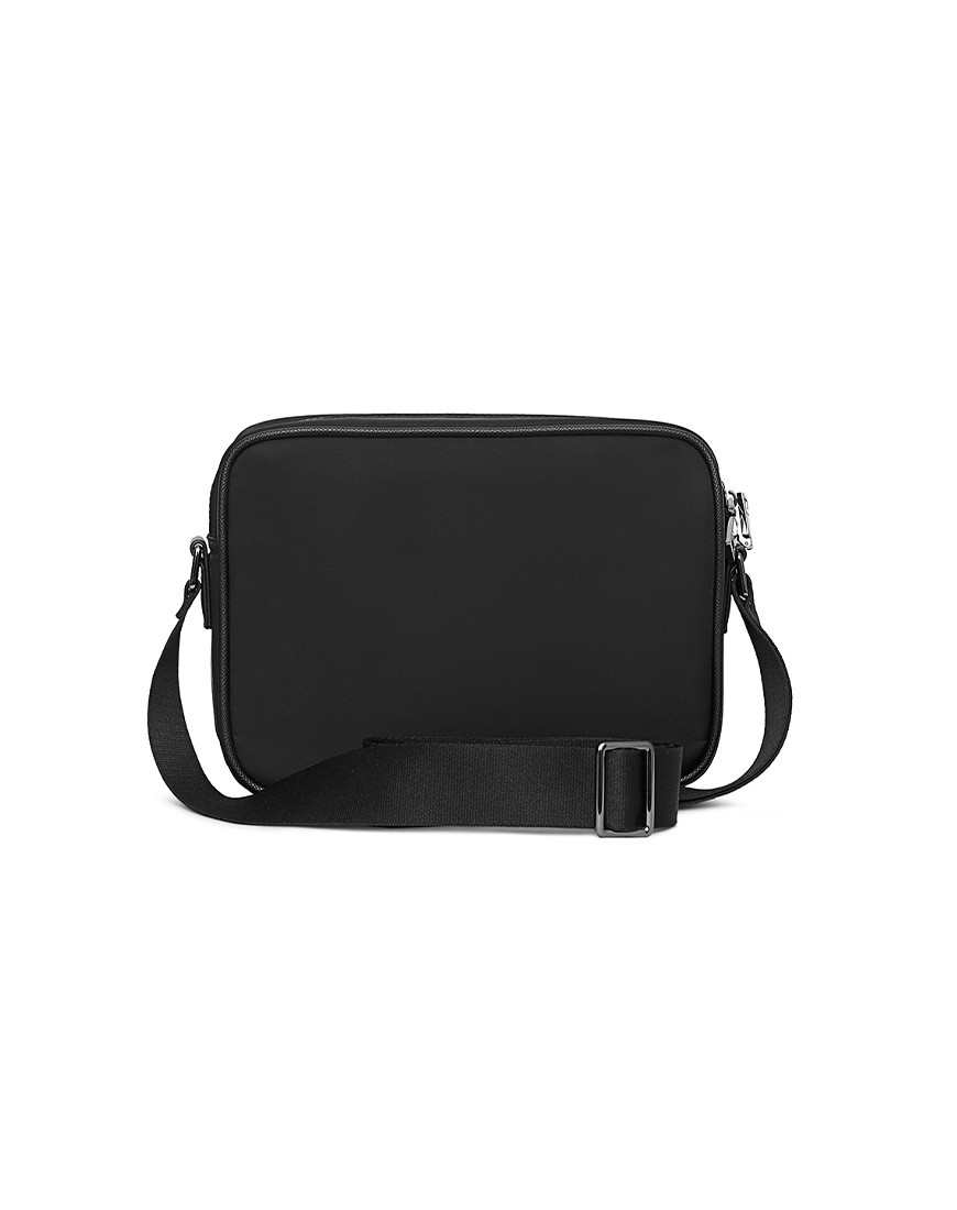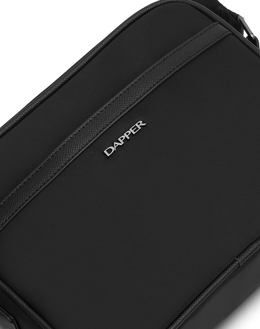 DAPPER Zip crossbody bag, Combines Cross grain faux leather and Smooth Nylon fabric with Dapper shiny black metal emblem on front Compact size is compartmentalized for optimal organization. Plastic zip main pocket friendly with gadgets. Internal nylon zipped pocket. Insert front pocket with Magnetic closure, Faux leather binding. This bag is practical and easy to match with modern style. Monochrome.