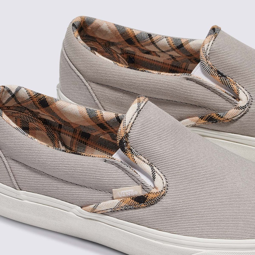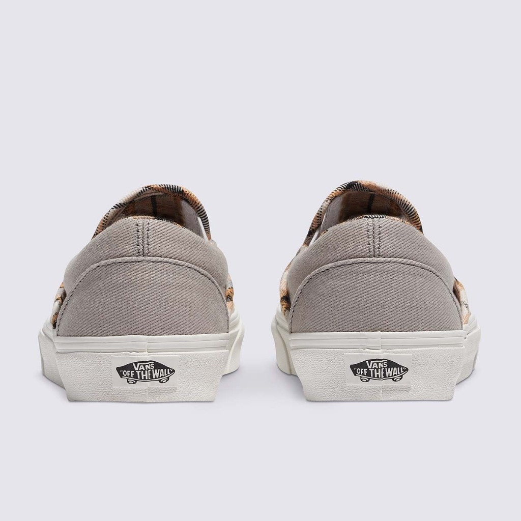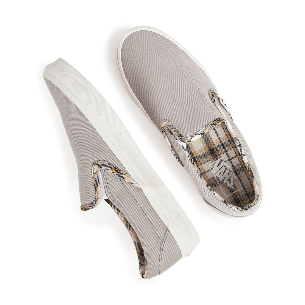It's all about the fun pop of pattern in these neutral slip-ons. The Vans Classic Slip-On Field Daze Drizzle is a light grey neutral canvas upper slip-on with hits of brown/yellow plaid liner and pipping. The classic slip-on, as always, includes the signature waffle sole, vulcanized rubber, padded collar and elastic accent for easy on and off.