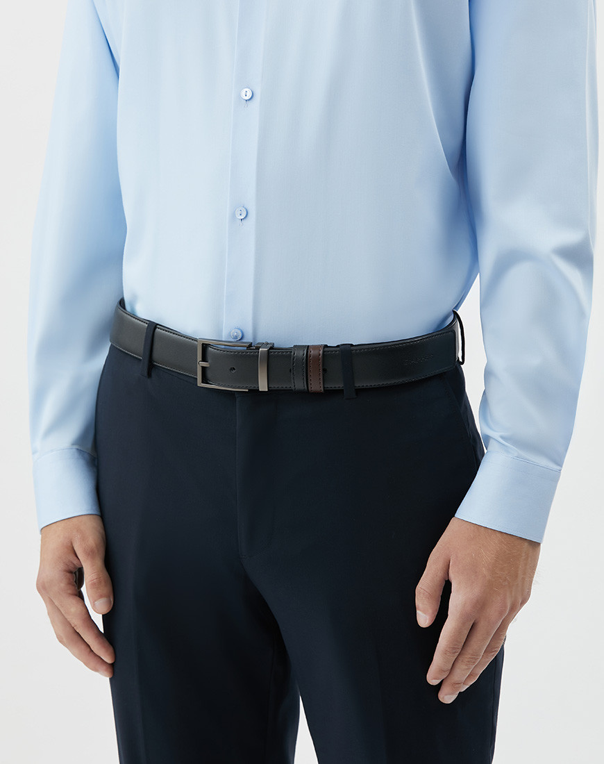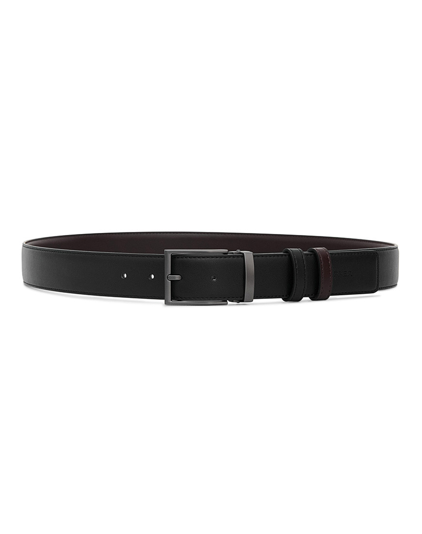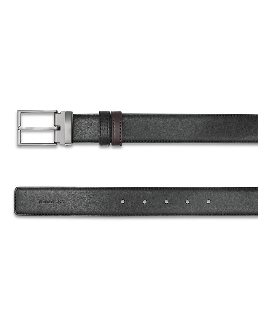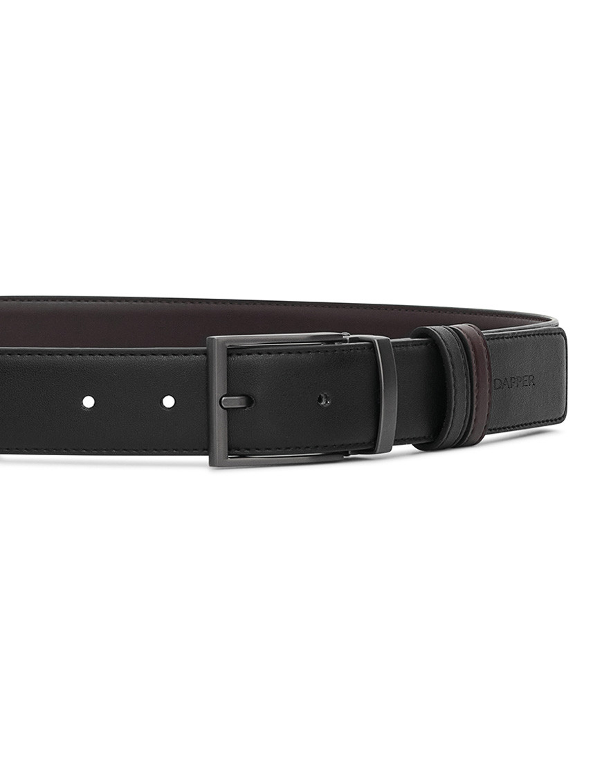 Pin Buckle Vegan Leather belt made of Smooth black vegan leather match with brown at back part. Buckle made of Lightweight Zinc Alloy in Basic Slim shape with Matte Gun metal finishing Leather strap can be cut to fit with Dapper logo debossed at the end of strap. Timeless & Versatile