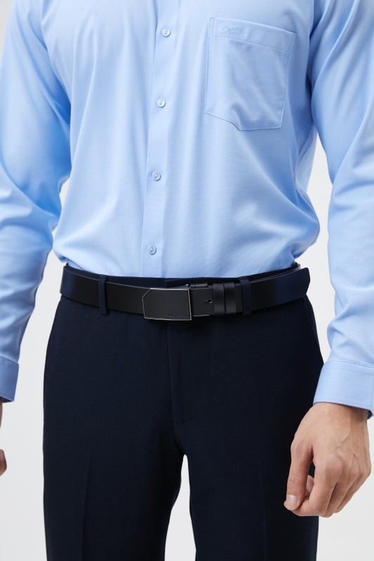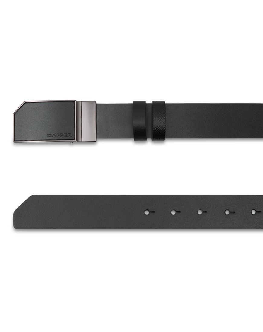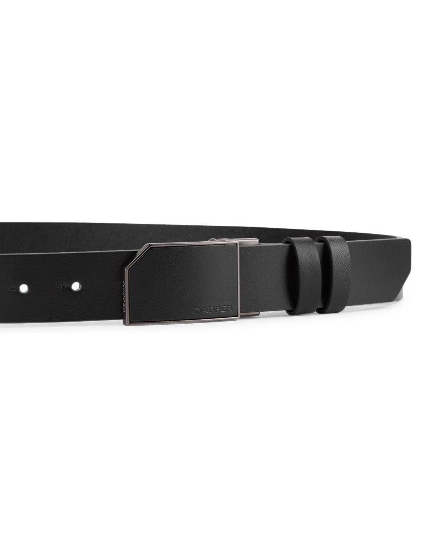 Reversible Snip corner Rectangle Plaque buckle belt made of Smooth black genuine leather works with tailoring and cross grain textured leather in black looks good for casual occasion. End of belt strap has snip corner match with Leather inlay belt buckle. Dapper logo engraved on buckle.
