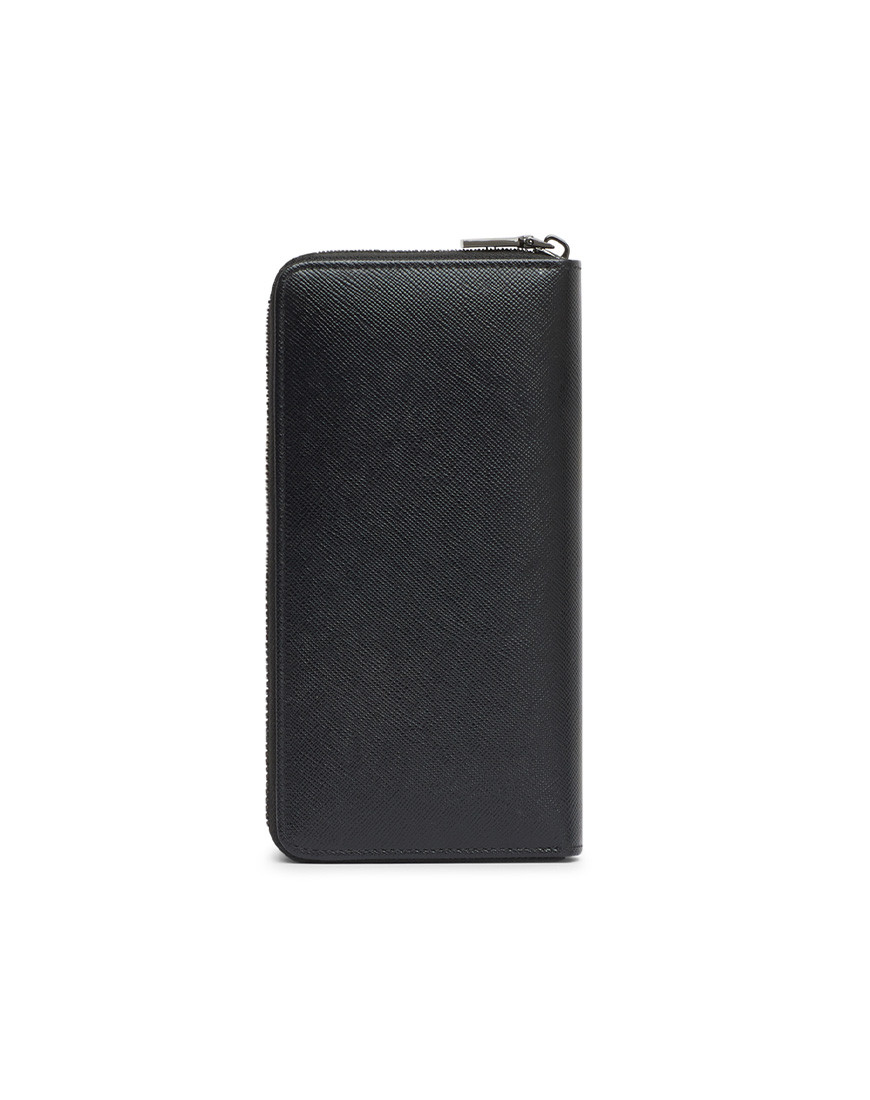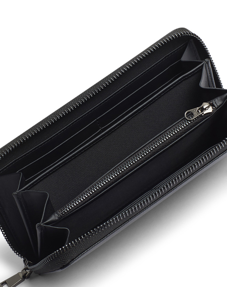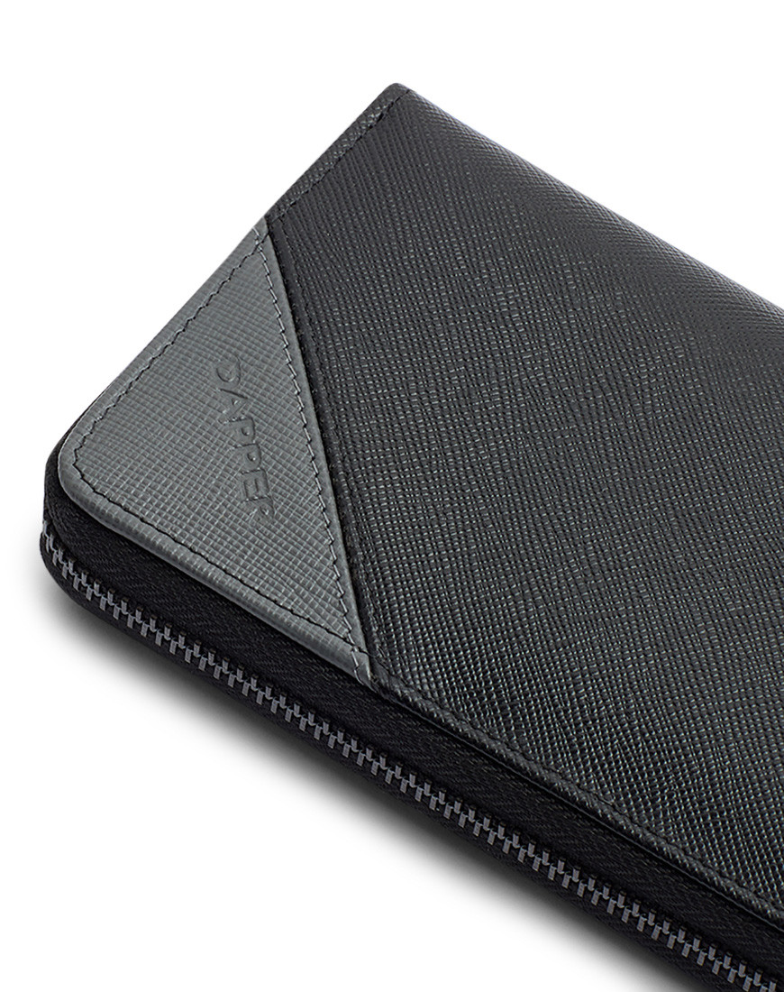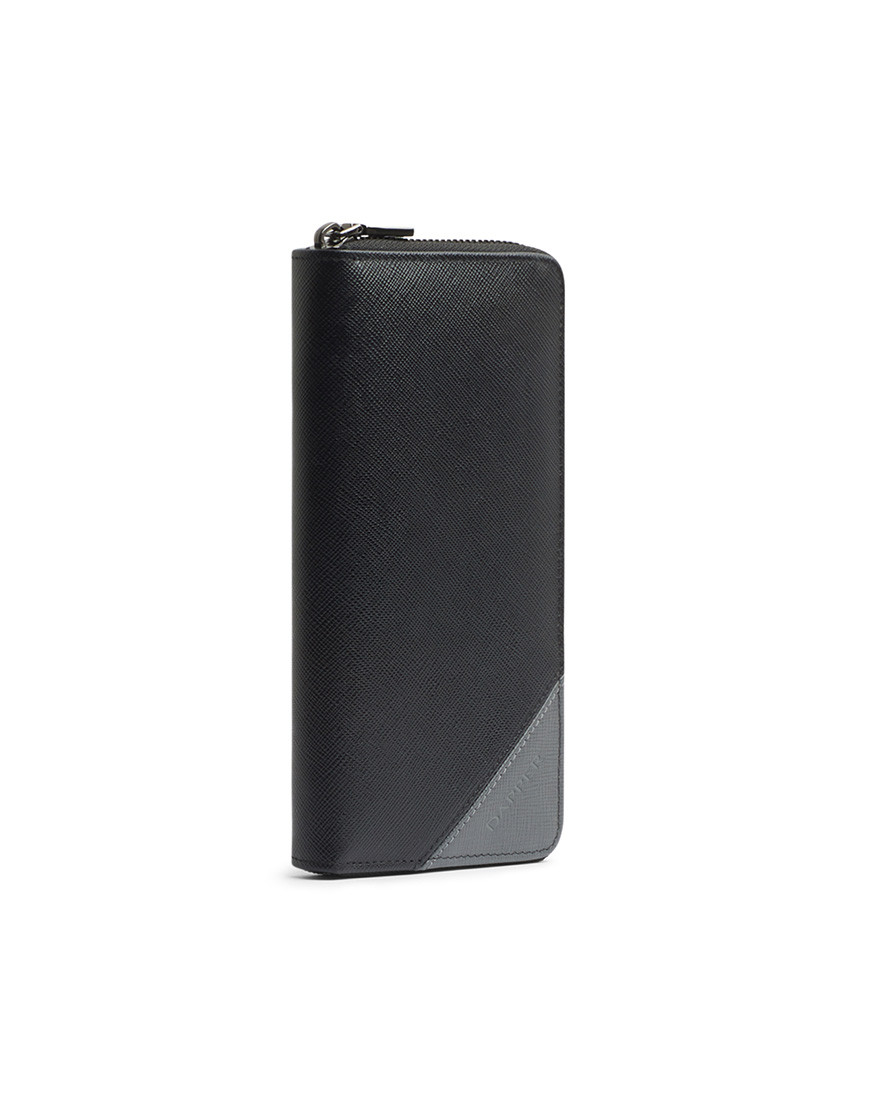 Accordion Long Wallet in black Cross Grain leather. Zip-around closure with two full length bill compartment twelve credit card and coin pocket with zipper Body made from genuine leather in black & Grey Diagonal corner with Dapper logo