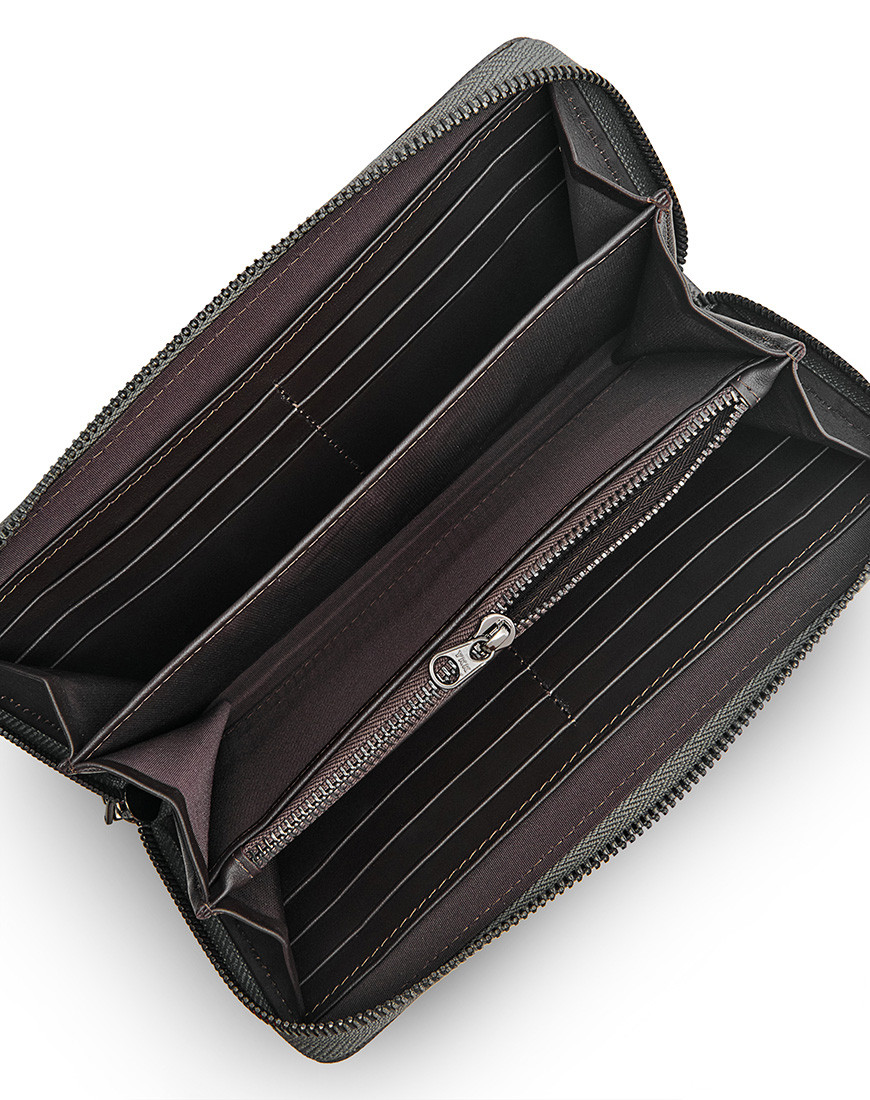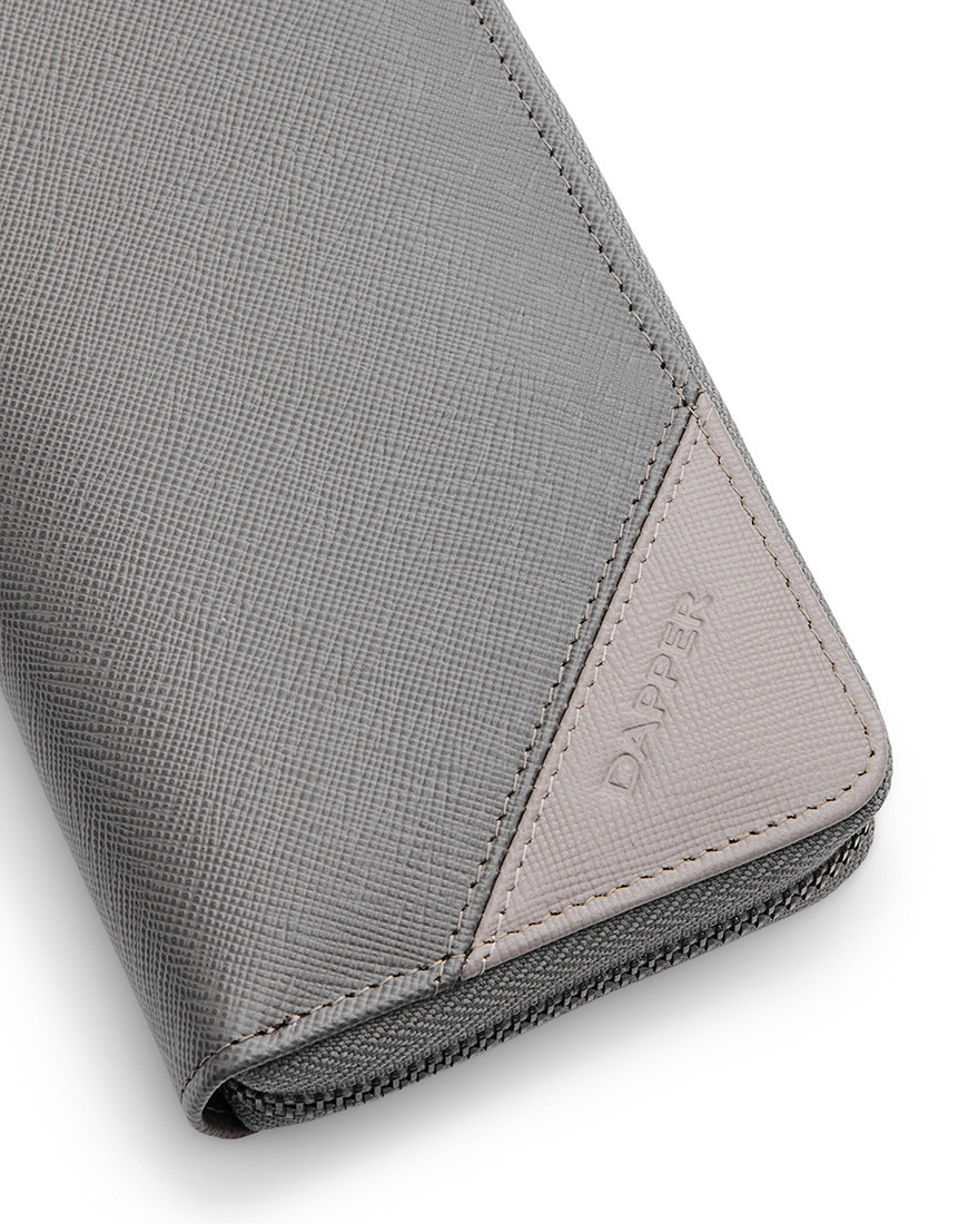 Accordion Long Wallet in black Cross Grain leather. Zip-around closure with two full length bill compartment twelve credit card and coin pocket with zipper Body made from genuine leather in grey & taupe Diagonal corner with Dapper logo