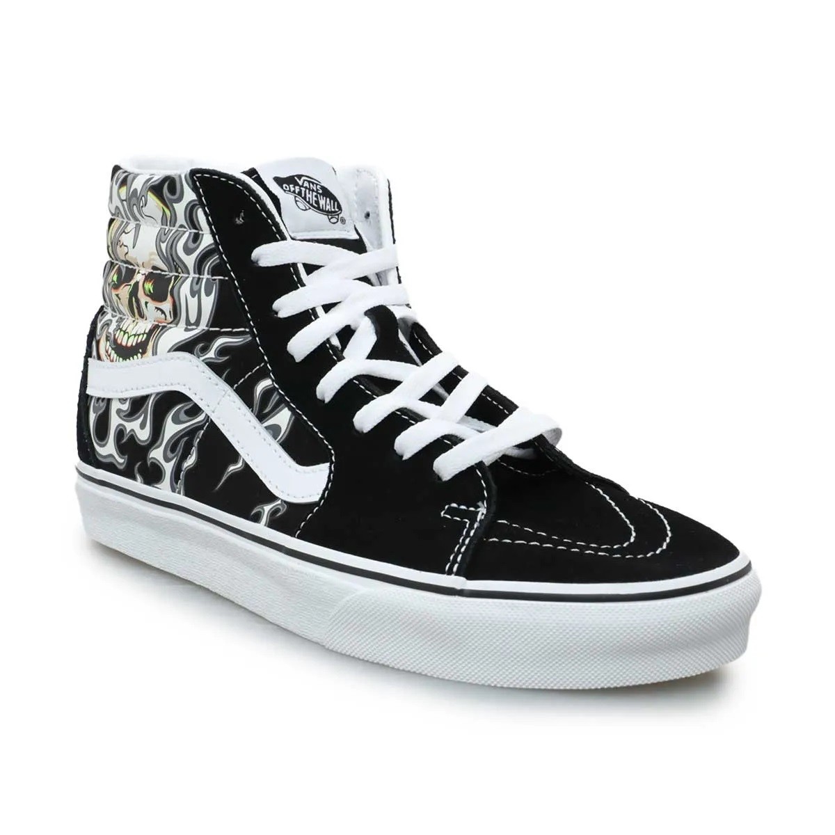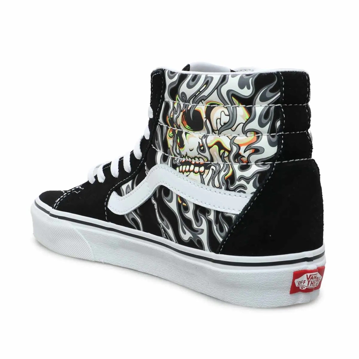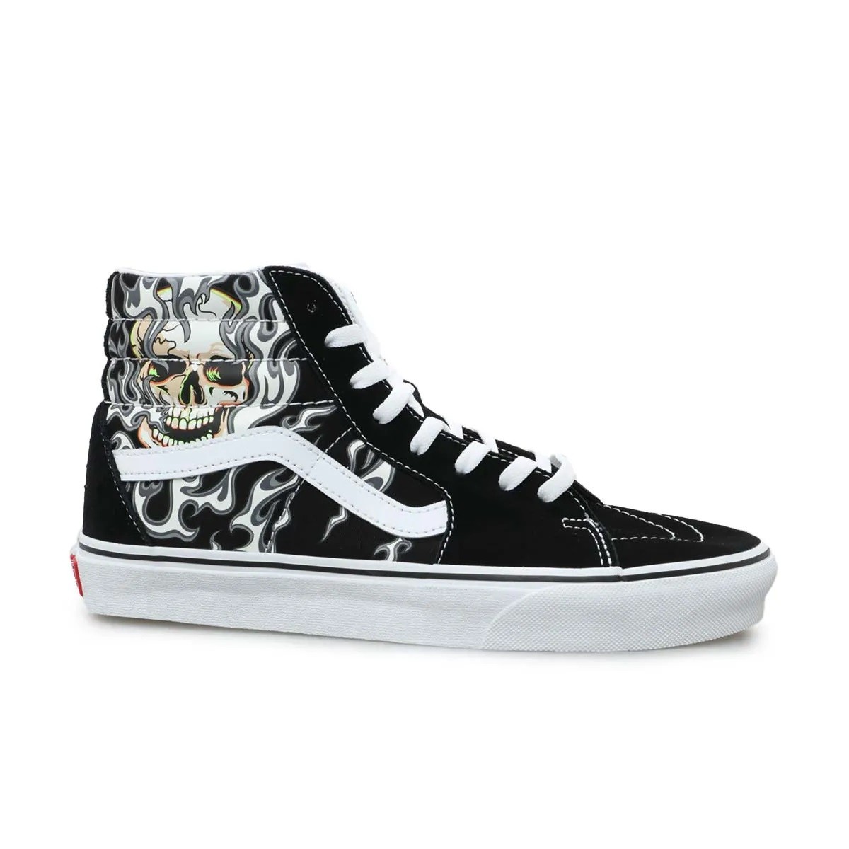 The Sk8-Hi was a game changer as the first high-top skate shoe to break onto the scene. With a padded collar for ankle support and reinforced toe caps, it remains a style like no other. The Sk8-Hi was our second model to showcase the Vans Sidestripe, and its bold design has remained iconic ever since. With a print featuring a smiling skull encased in flames, this Sk8-Hi adds a rebellious edge to this timeless shoe.