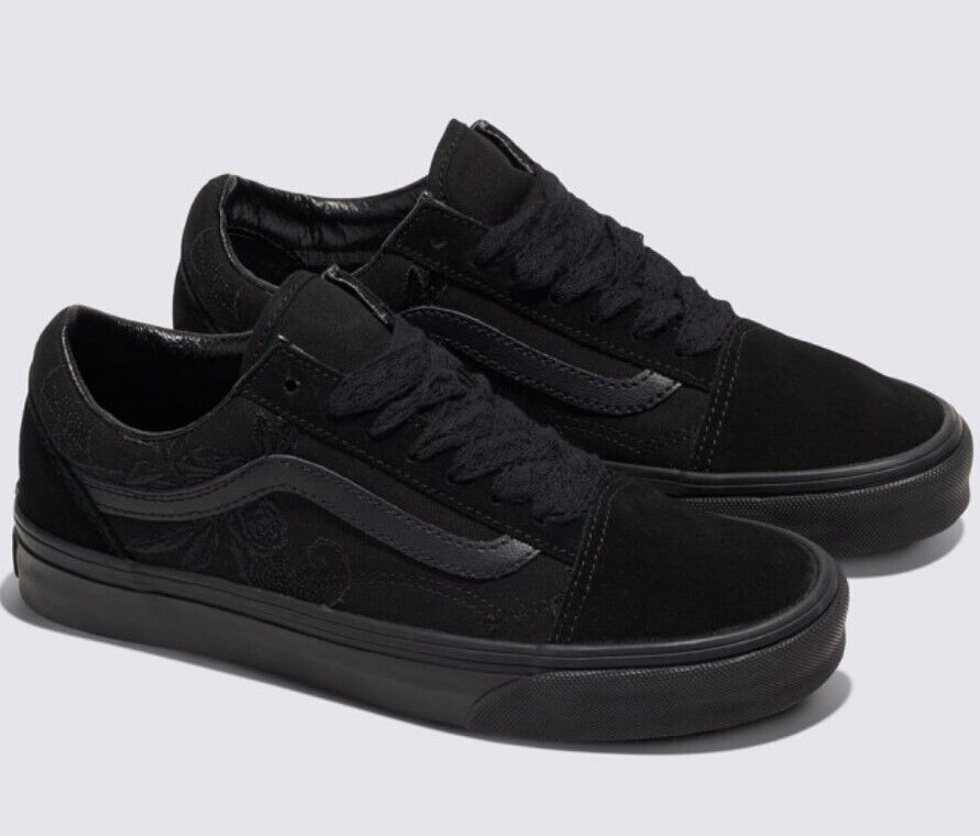 Add a darker take on timeless style to your look with the Old Skool Embroidery Skate Shoe from Vans! This morose skate sneaker rocks sturdy canvas and suede uppers with embroidered floral designs, spiders, and webs, signature leather side stripe, and waffle tread platform sole for reliable traction.