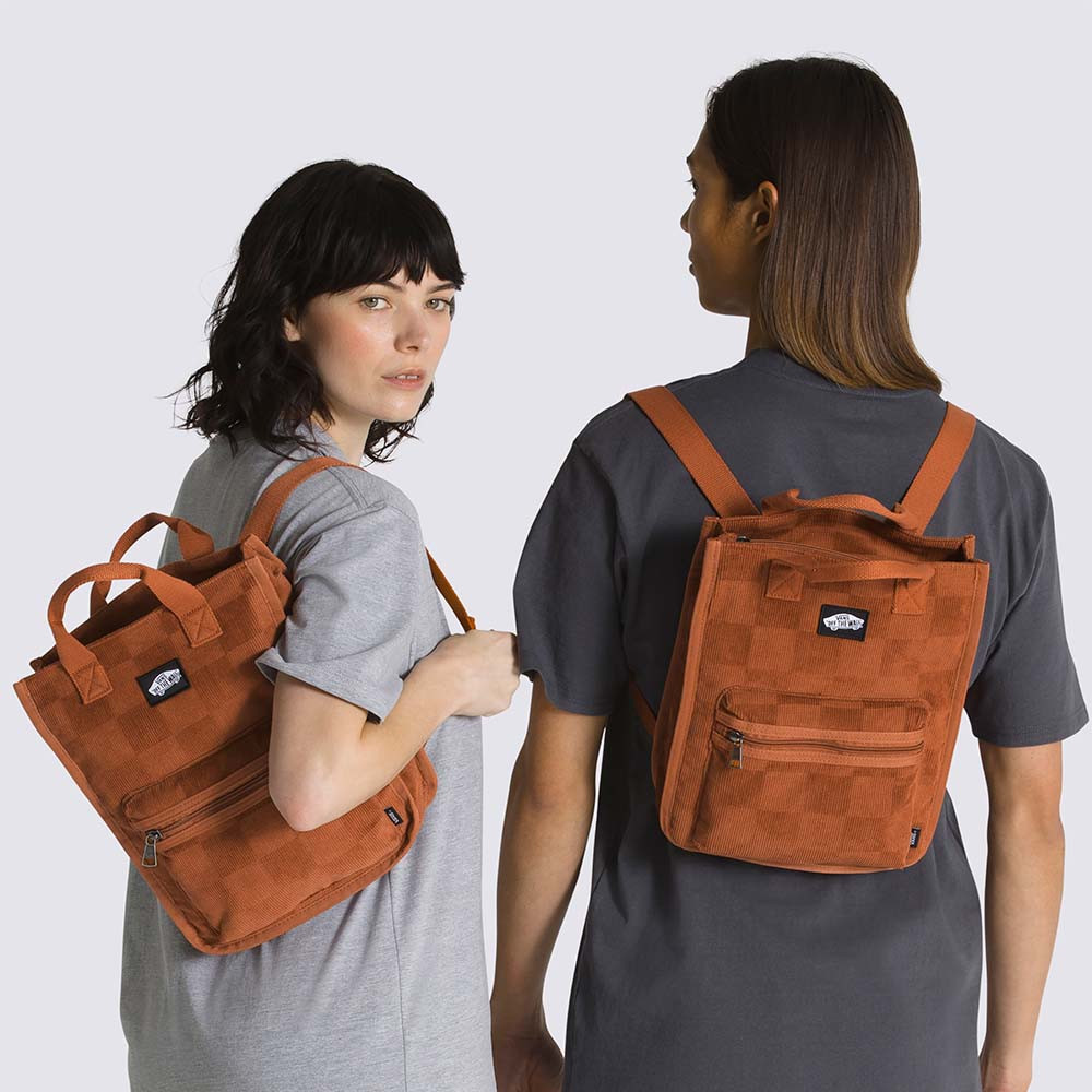 The Free Hand Backpack is a cotton tote backpack with adjustable web straps and features a tonal checkerboard pattern, top handle, and a front zip compartment for added storage and organization.